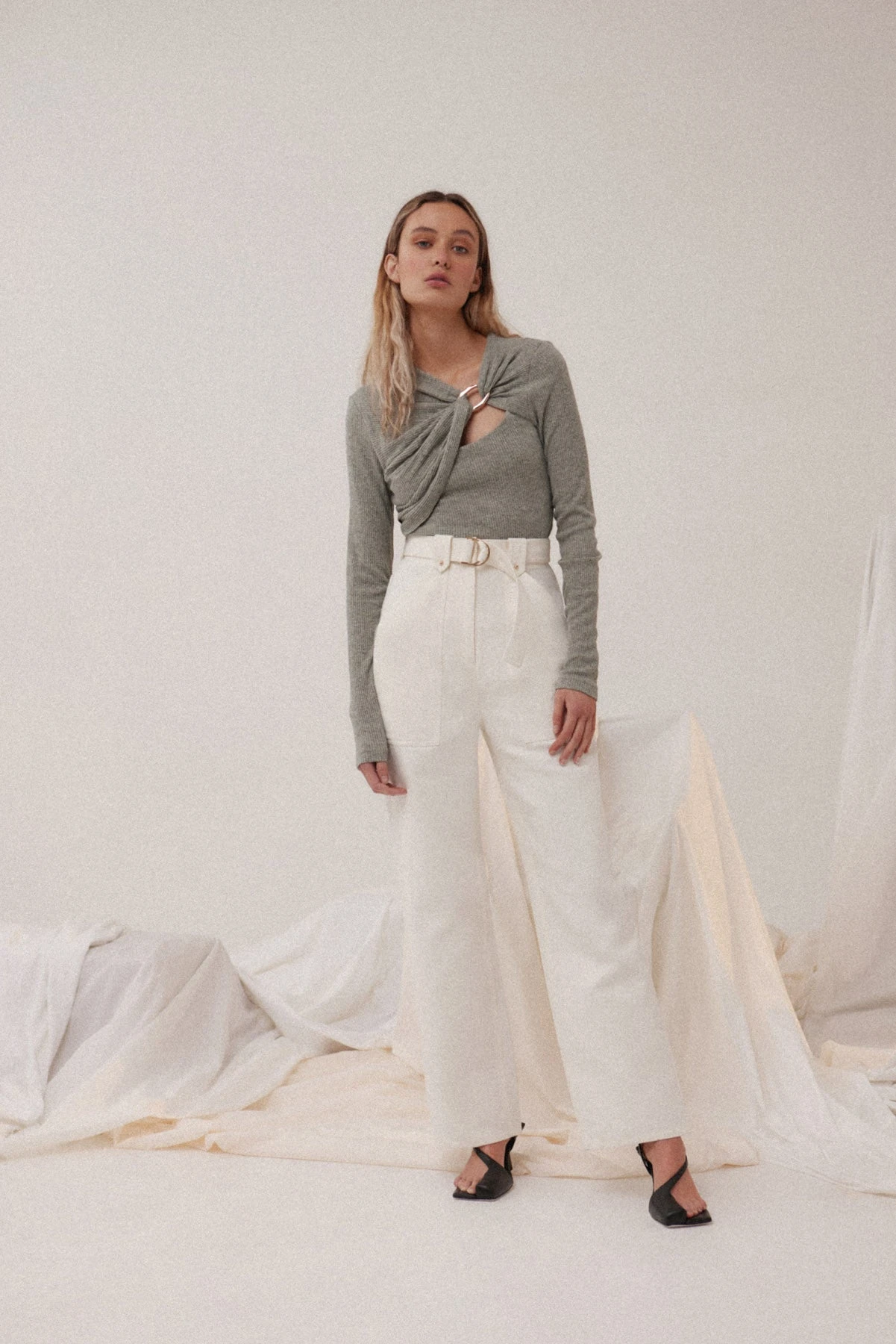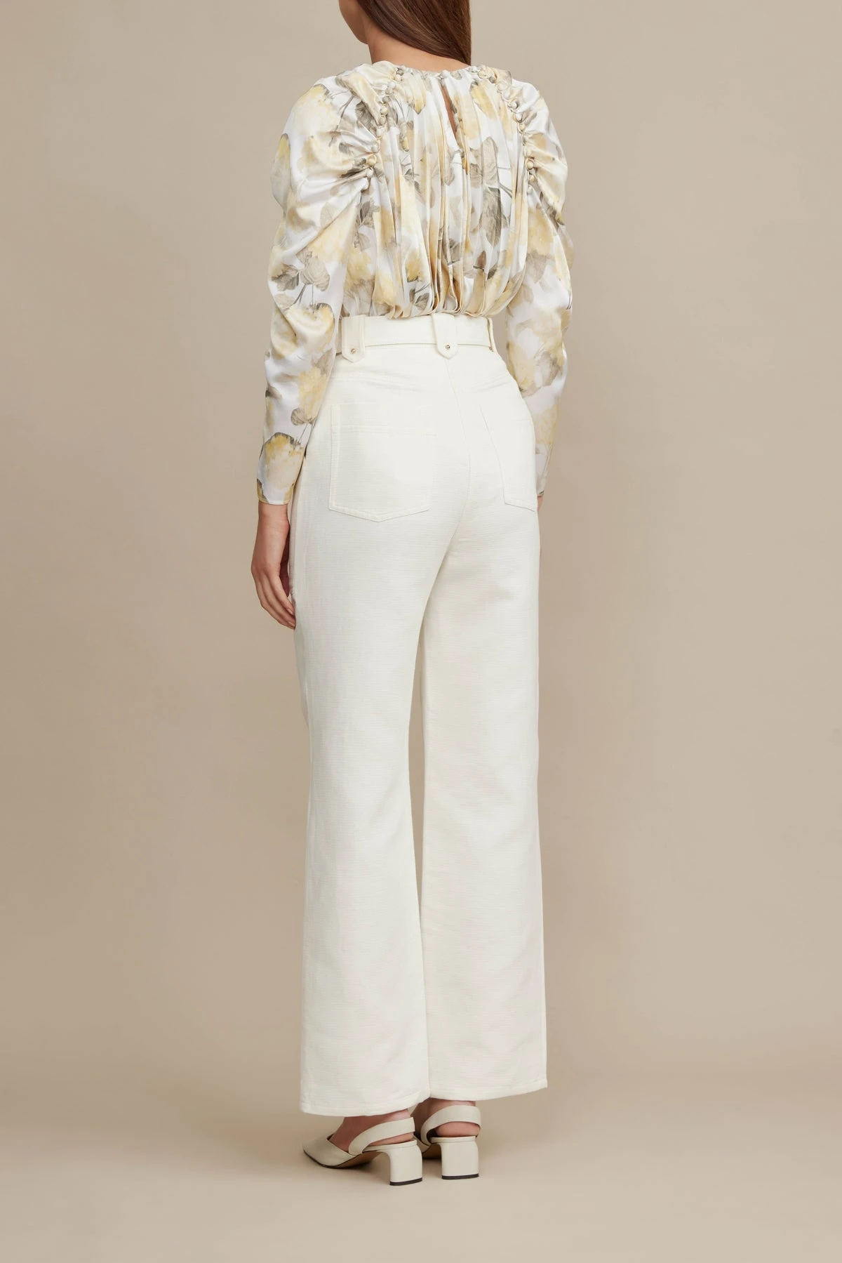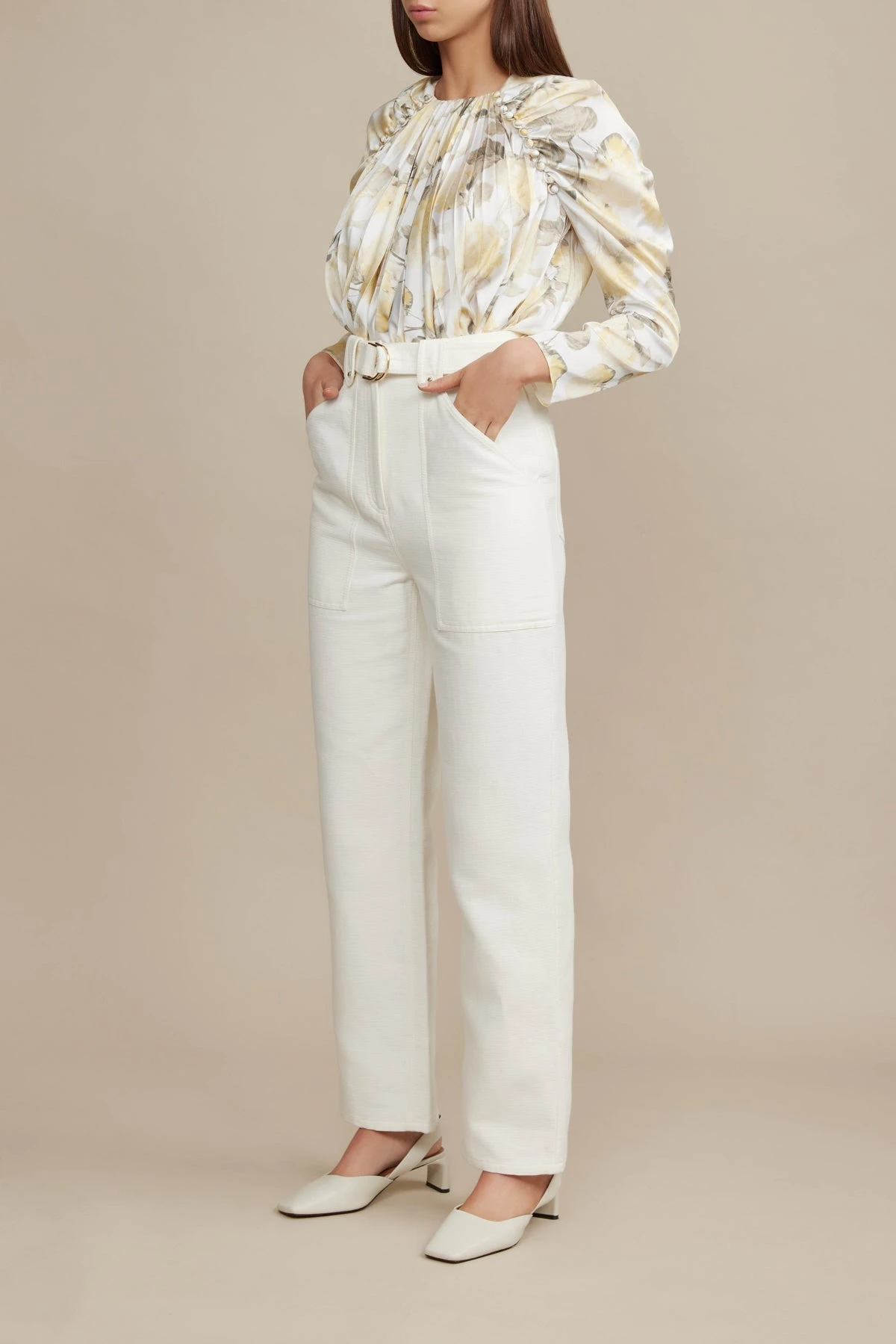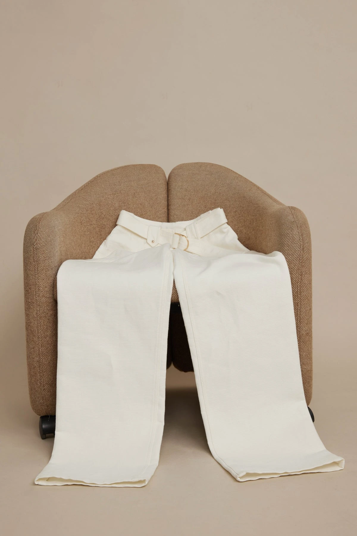 The Bancroft Pant in Ivory are fitted at the waist and relaxed toward the hem. Complimented with luxe gold hardware, this style features functional pockets, adjustable waist belt and front fly closure. Cotton/linen blend fabrication permits comfort and long term wearability.