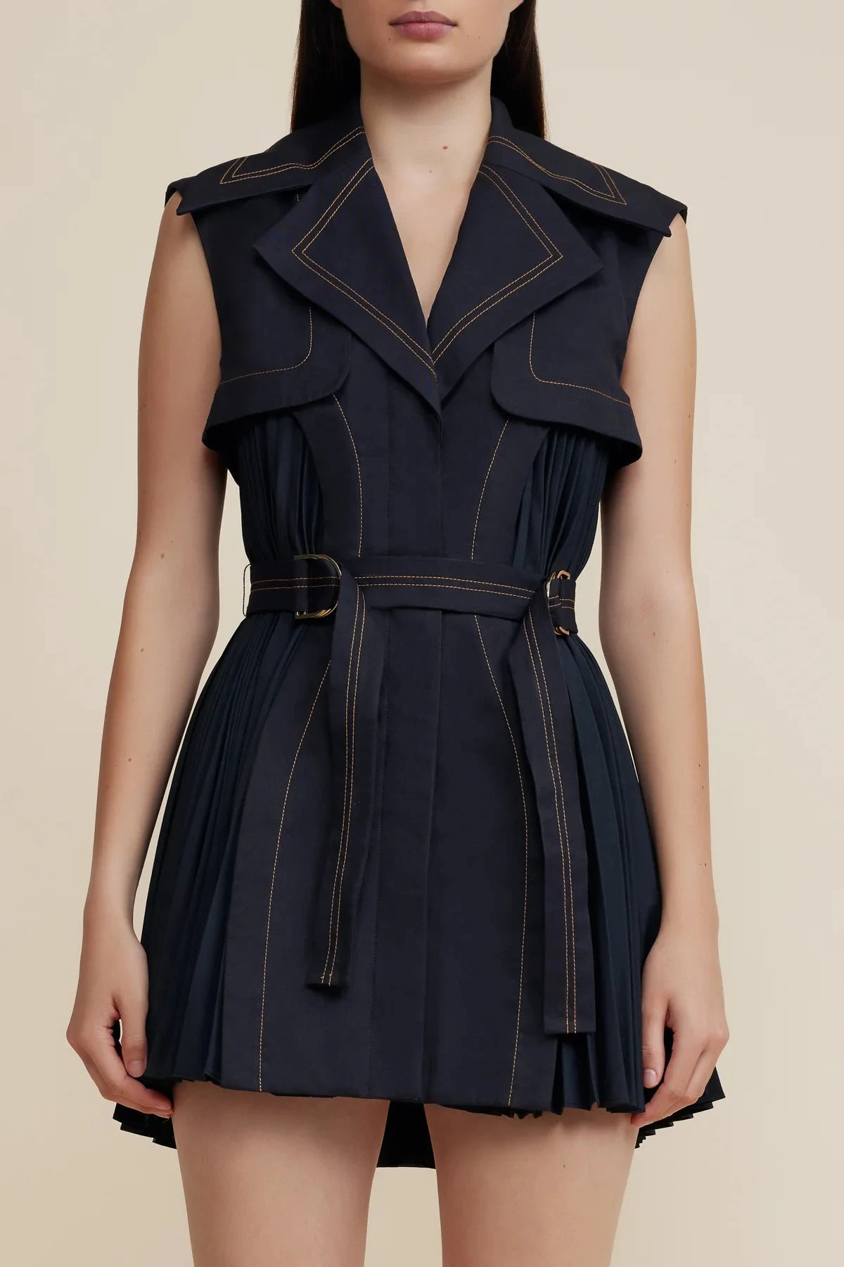 A utility inspired silhouette, updated with quintessential Acler design elements. The Bellevue Dress in Black is crafted from an easy wear cotton fabrication. Featuring an exaggerated collar, contrast top stitching, adjustable waist belt with luxe gold hardware and pleated detail through the side bodice.