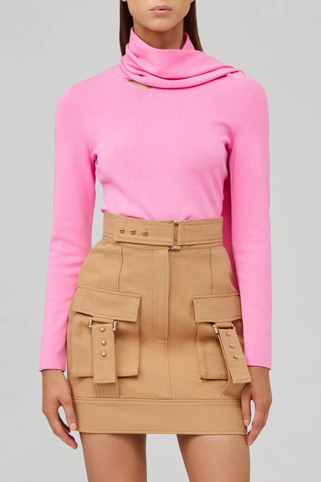 The Vermont Skirt in Biscuit is cut to be fitted through the body with utility style pockets and gold hardware waist belt. Structured fabrication makes this a stunning look for a formal day or evening event. Wear with open toe mule heels for an elevated look. Also available in Sorbet Pink.