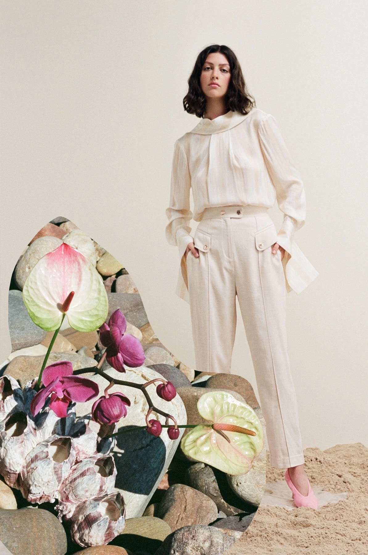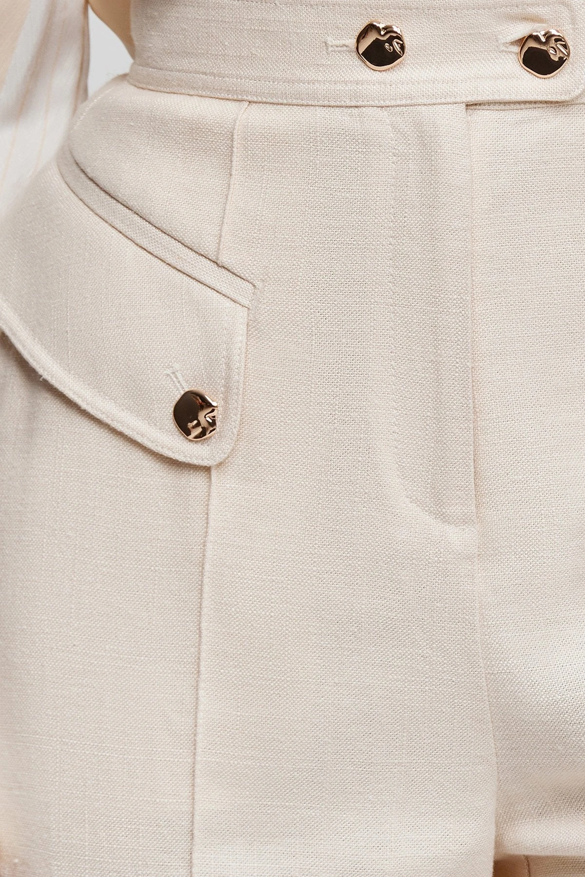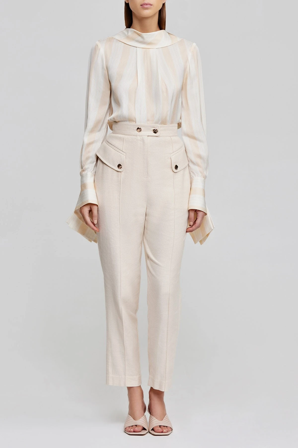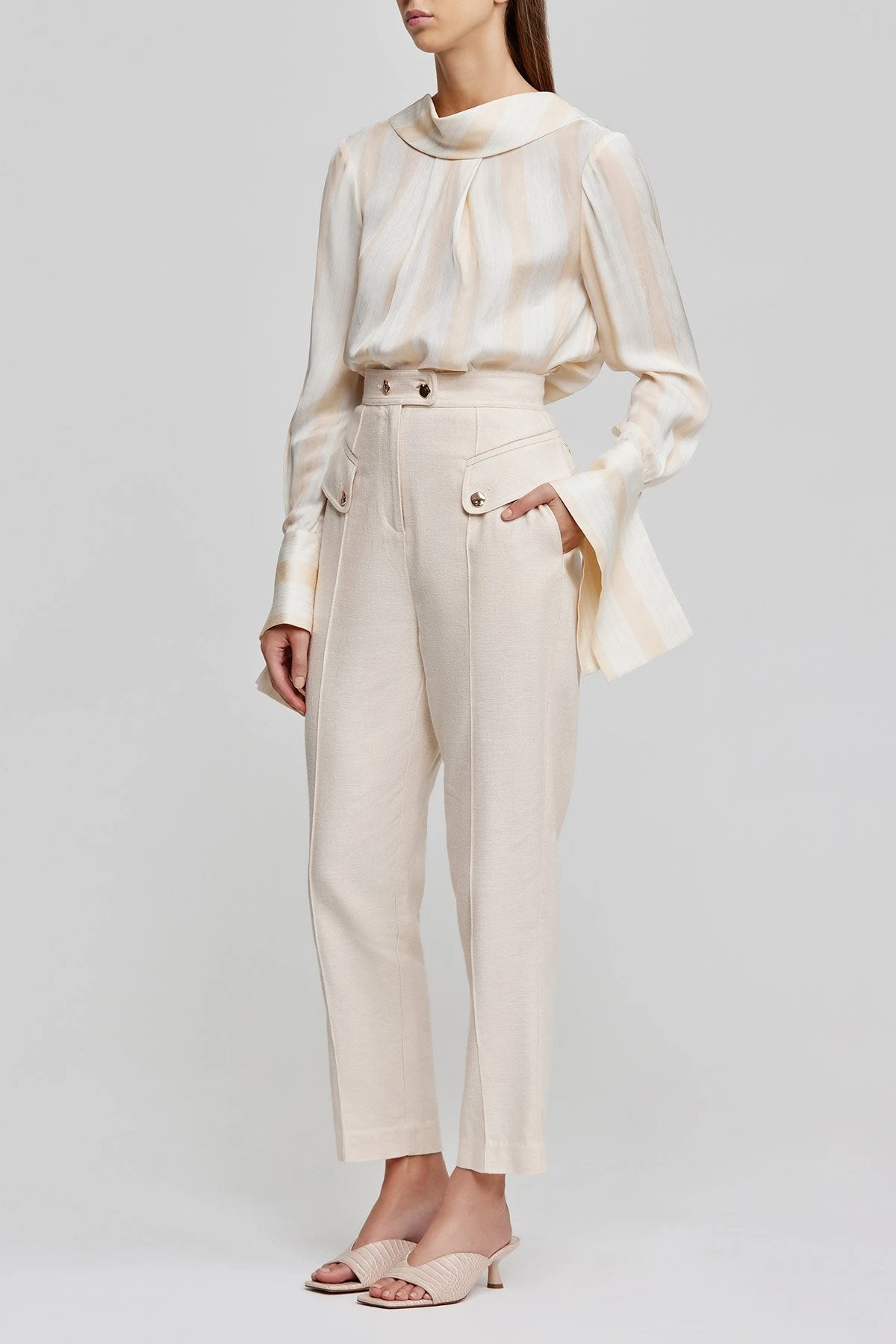 The Wilkinson Pant in Natural is designed to be fitted at the waist and relaxed toward the hem. Functional inseam pockets, gold hardware and fly front closure. Pair with the Wilkinson Blazer for the complete look.