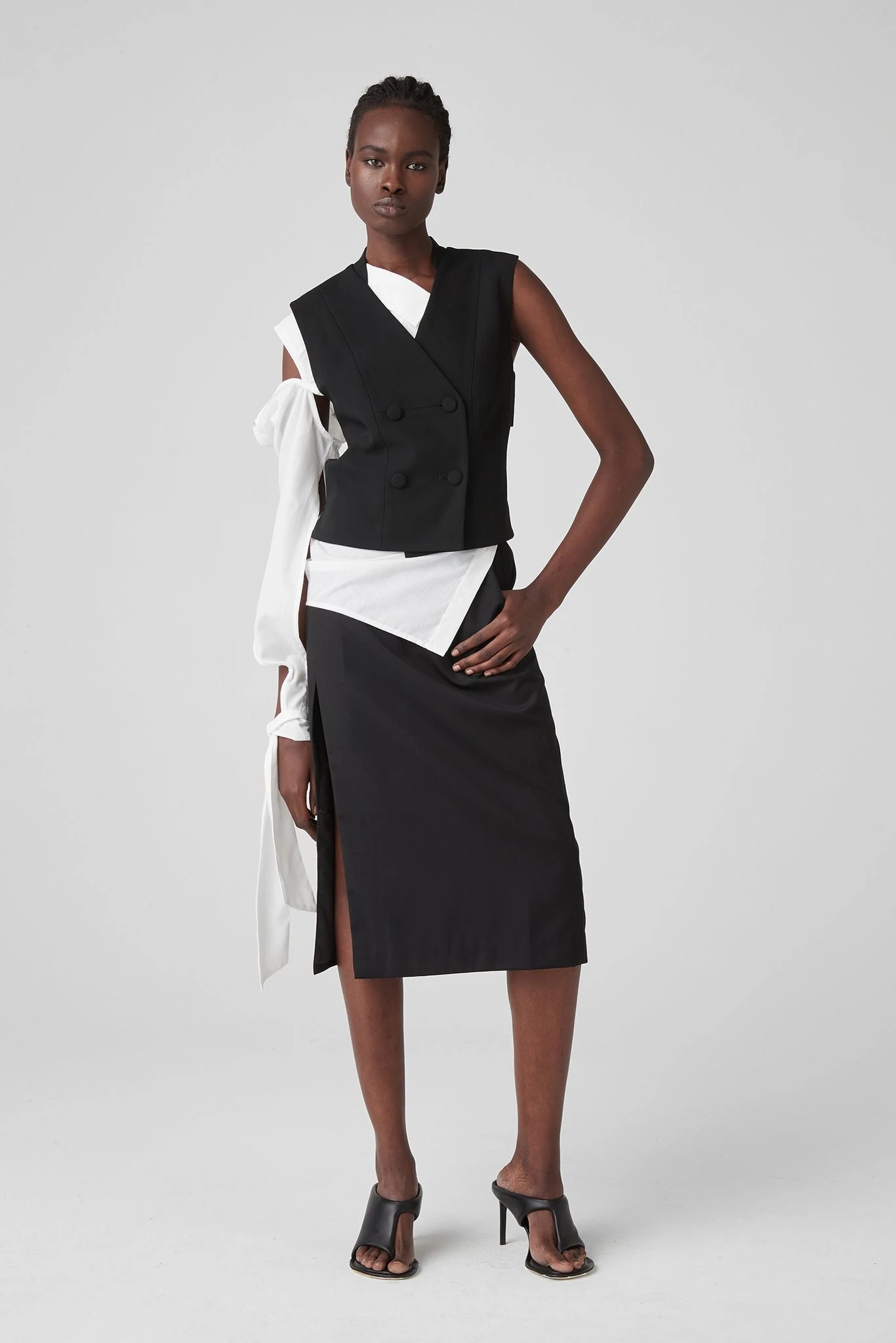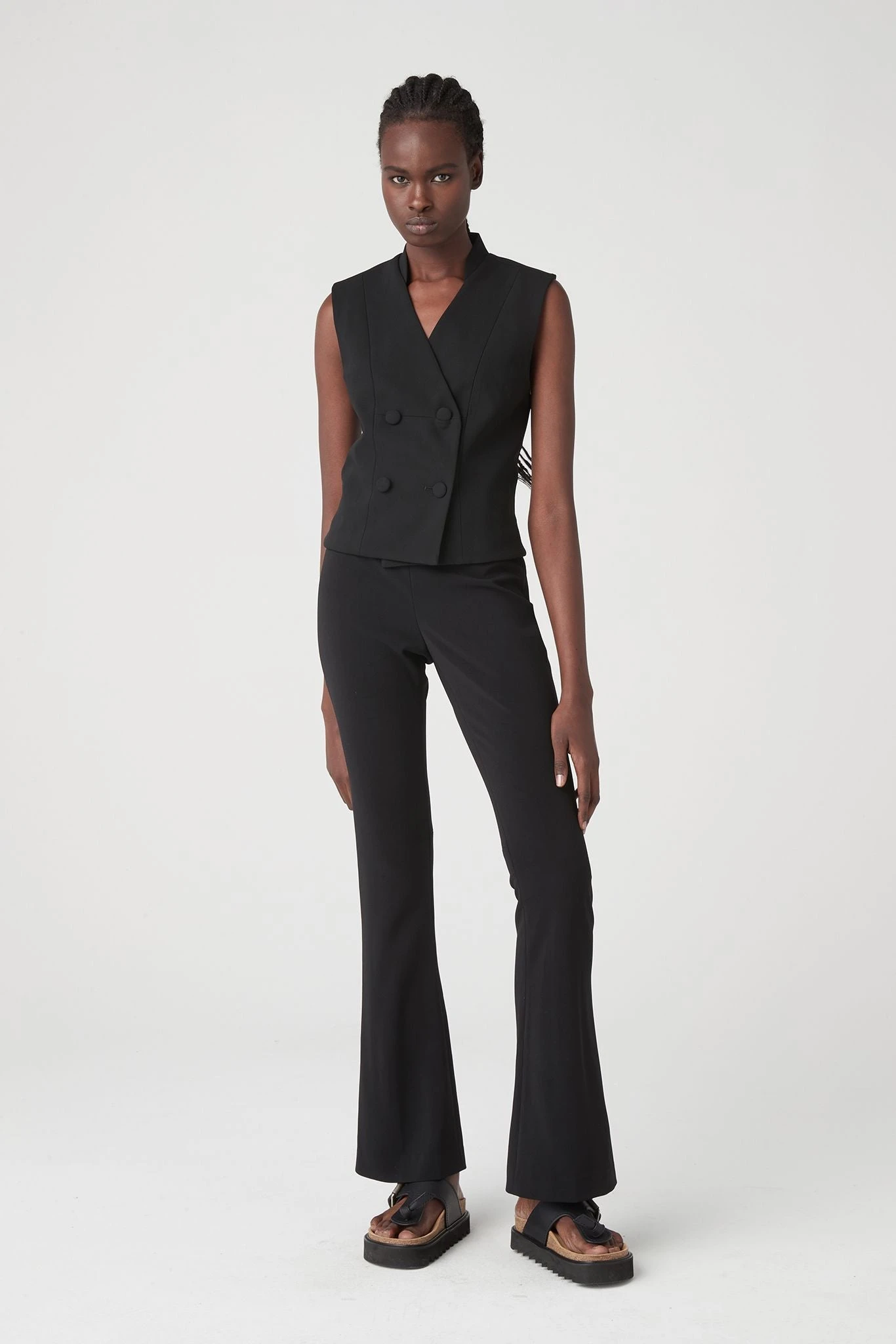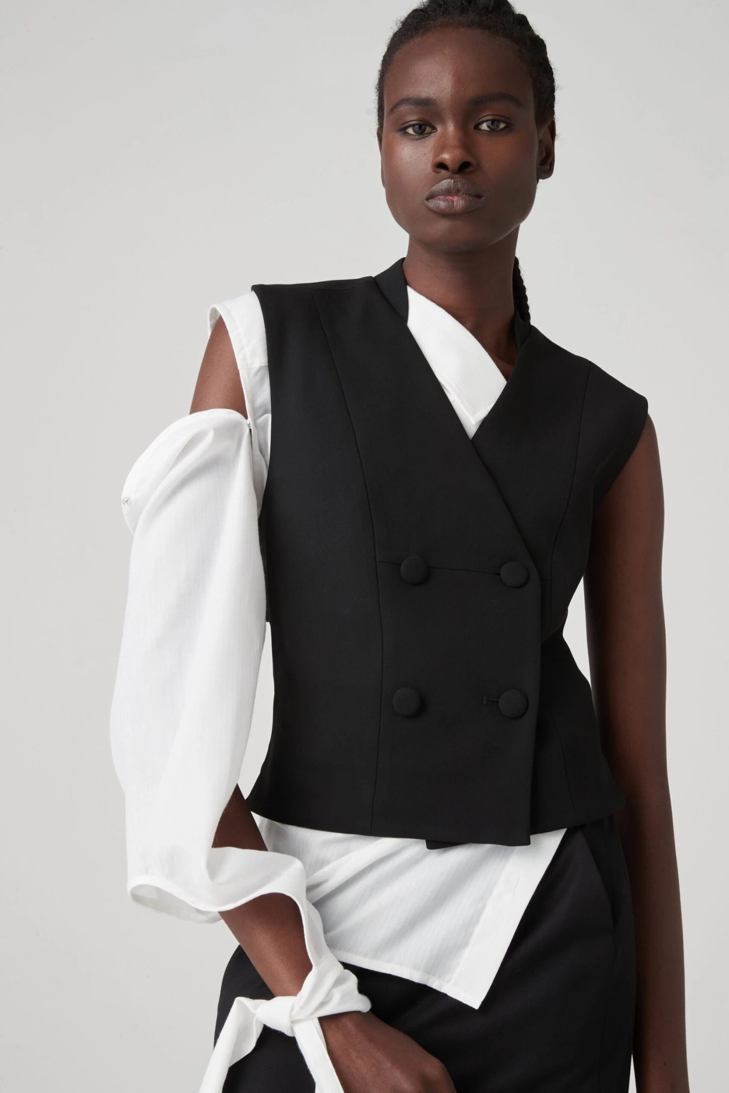 Add instant edge to your wardrobe with this classic vest with cross back detailing. Double breasted style with self covered buttons. Wear as it is styled with your favourite denim or suit pants, or layer over a crisp white business shirt for the office.