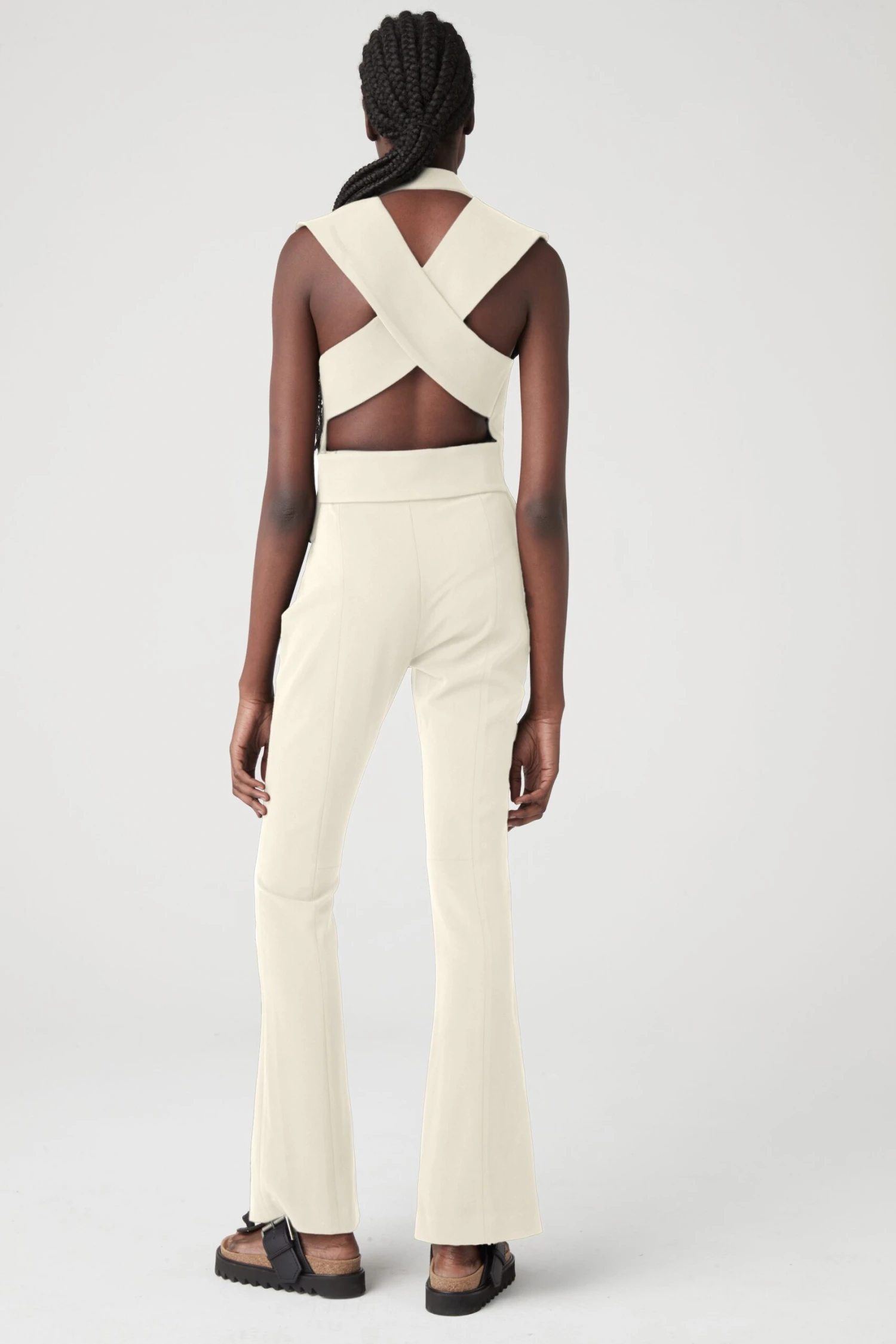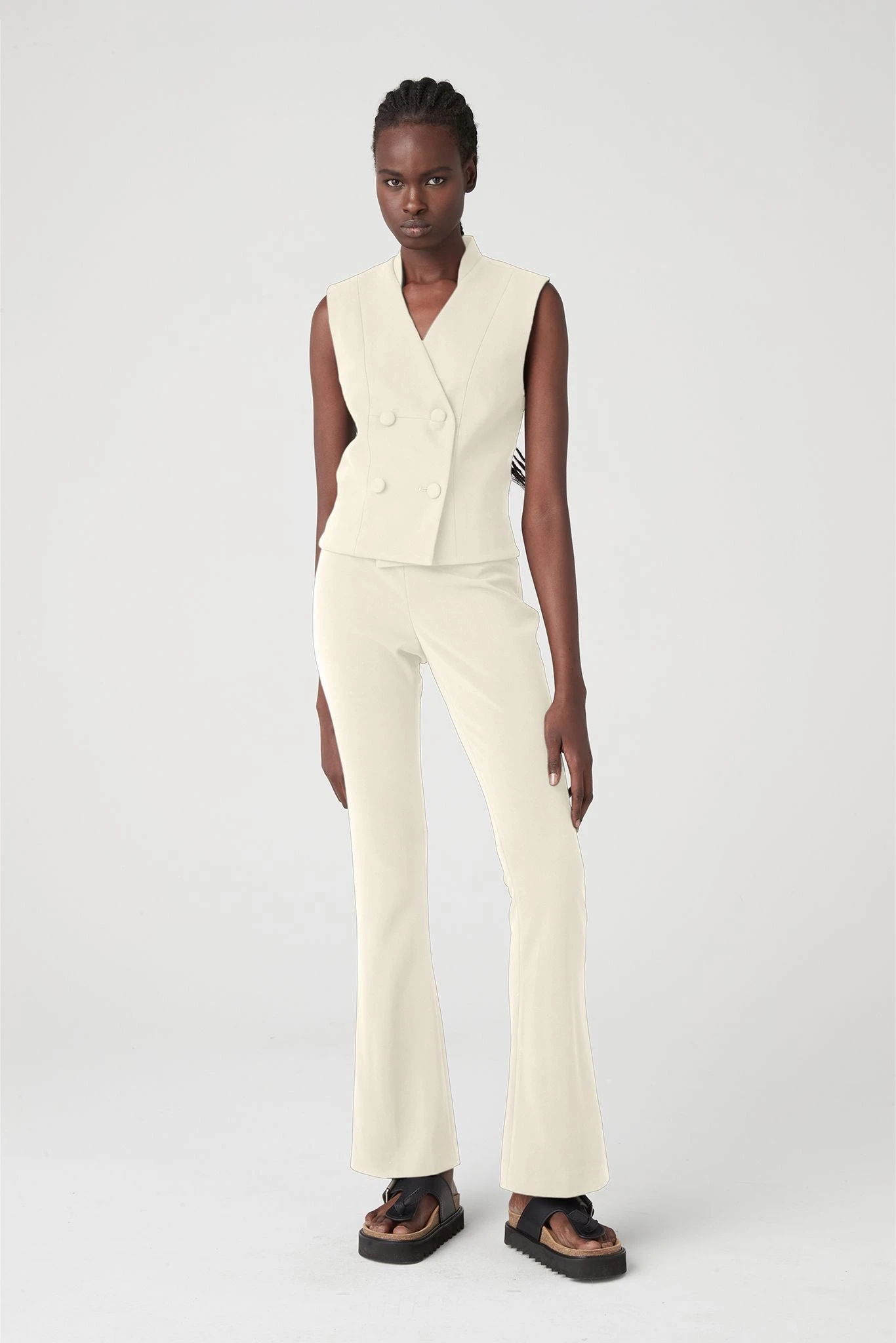 Add instant edge to your wardrobe with this classic vest in Straw with cross back detailing. Double breasted style with self covered buttons. We love this styled with the 001 Trouser in Straw for a modern take on suiting.