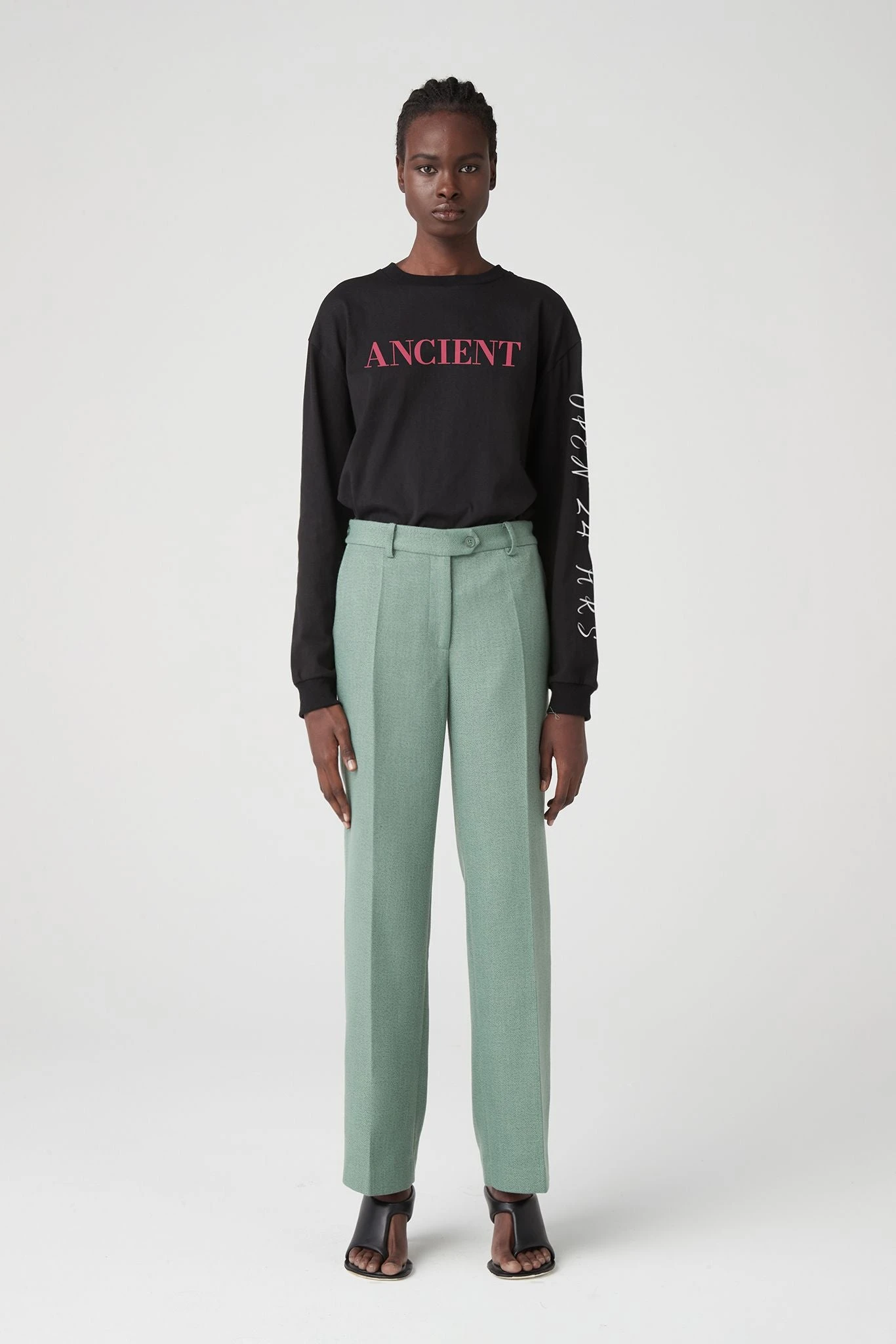 A mid-rise tailored pant with a straight leg and zip front closure at waist.