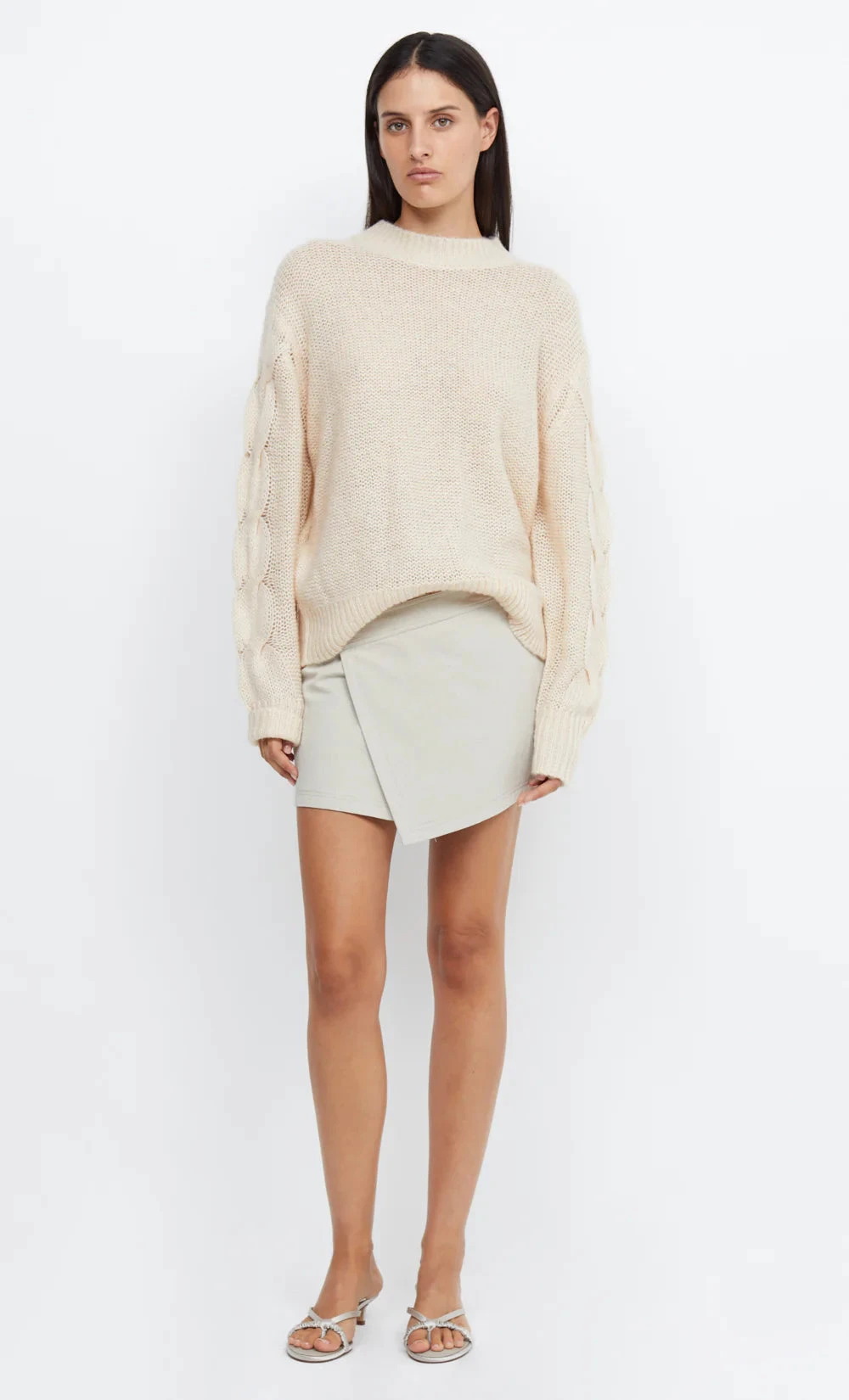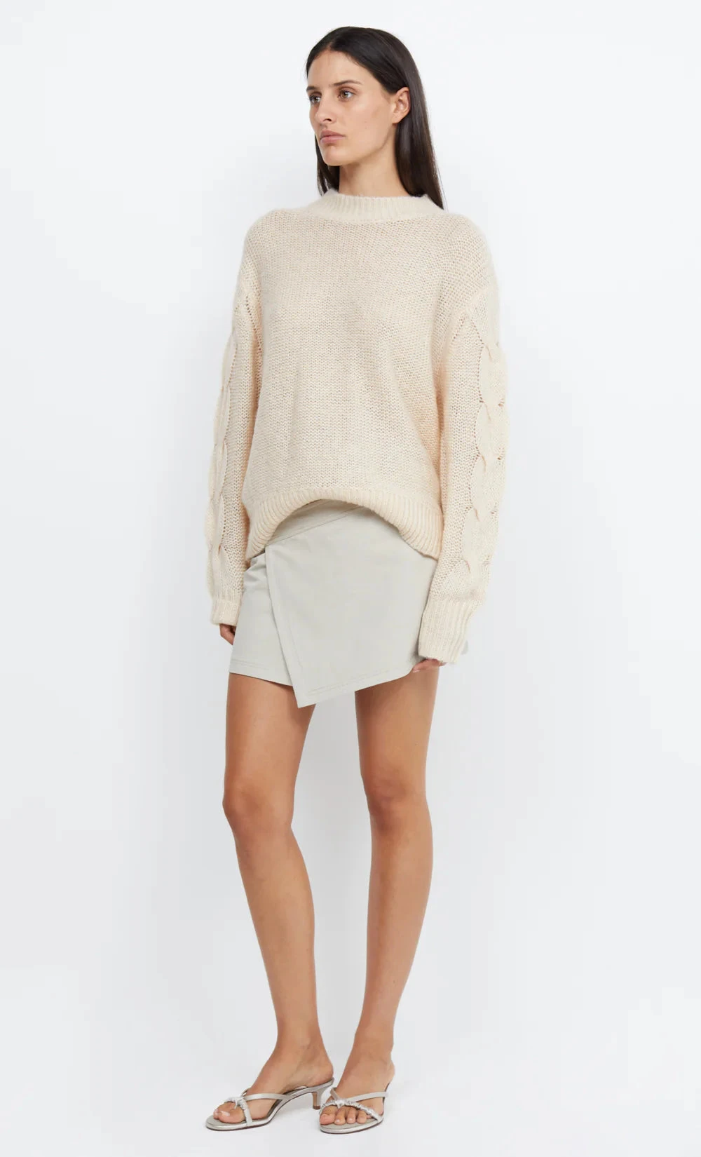 The Marion Knit Jumper is cut in a relaxed fit from a wool and mohair blend. The jumper features drop shoulders, large cable knit sleeve detail and ribbing at the crew neck, cuff and hem. Styled with our Flynn Wrap Mini Skirt.