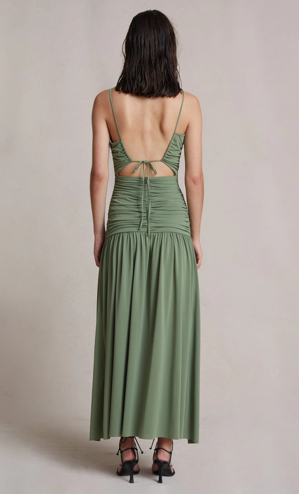 An easy to wear statement maxi dress with flattering gathered ruching and wrap detail around the waist and u-ring hardware at the centre front. The Vixen Maxi Dress features a classic straight neckline and adjustable tie at the back.