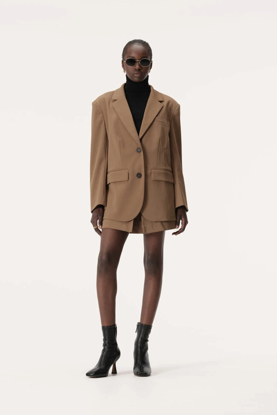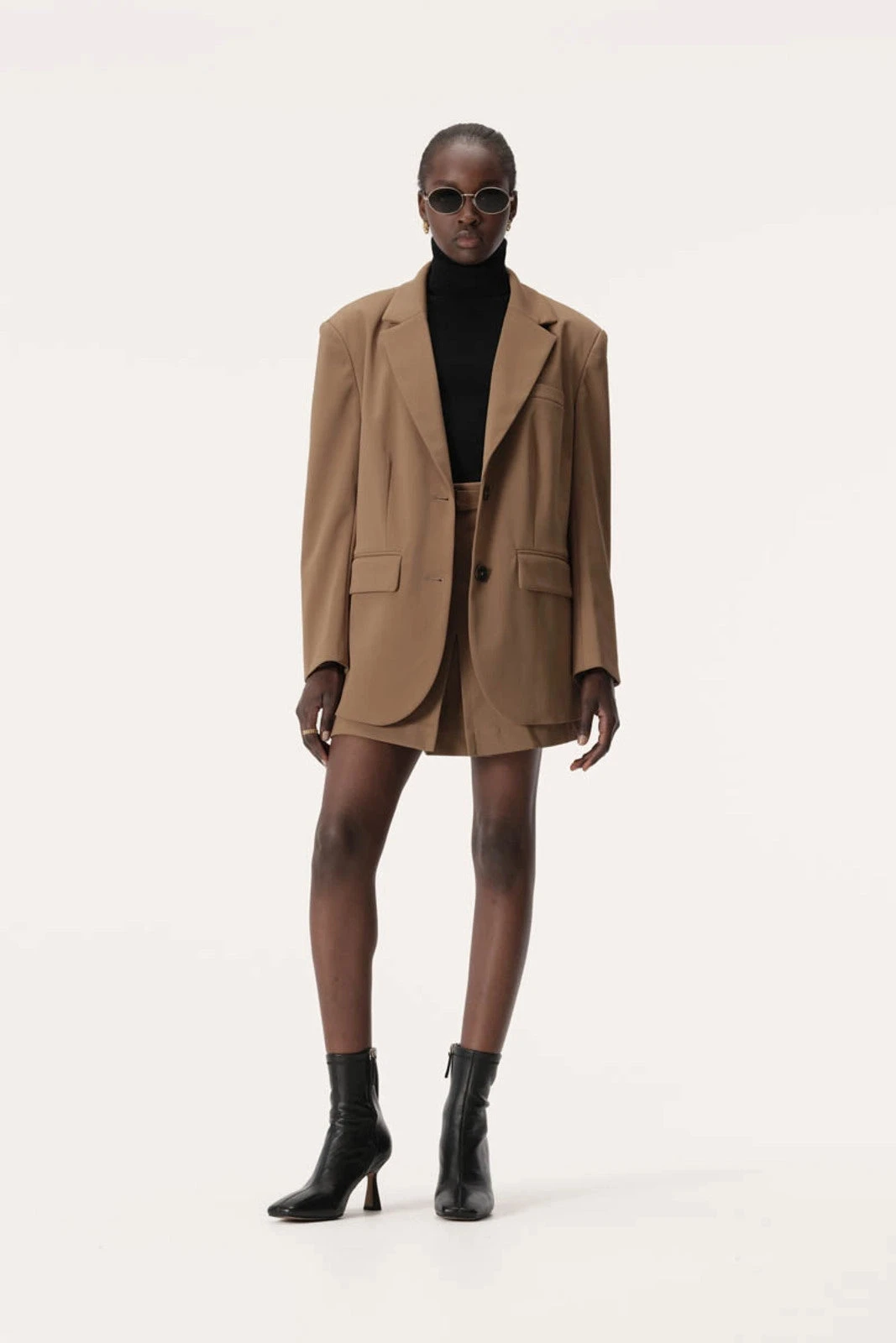 Autumn outfit essential, the Raquel Blazer is an oversized fitting silhouette, crafted in a weighty padded fabrication with traditional lapel, dual button fastening and hip pockets. Throw on over a light weight knit and a relaxed wide leg pant or team with the matching Raquel Skirt.