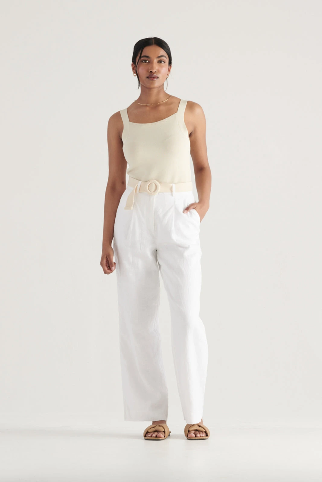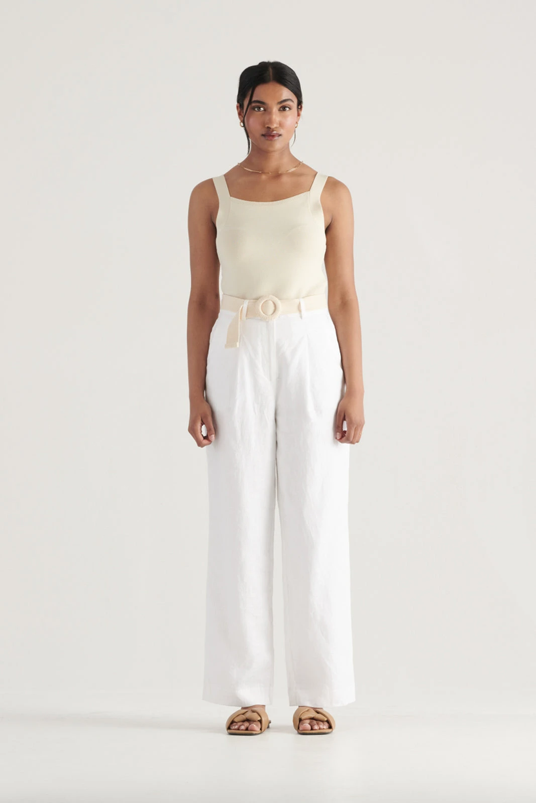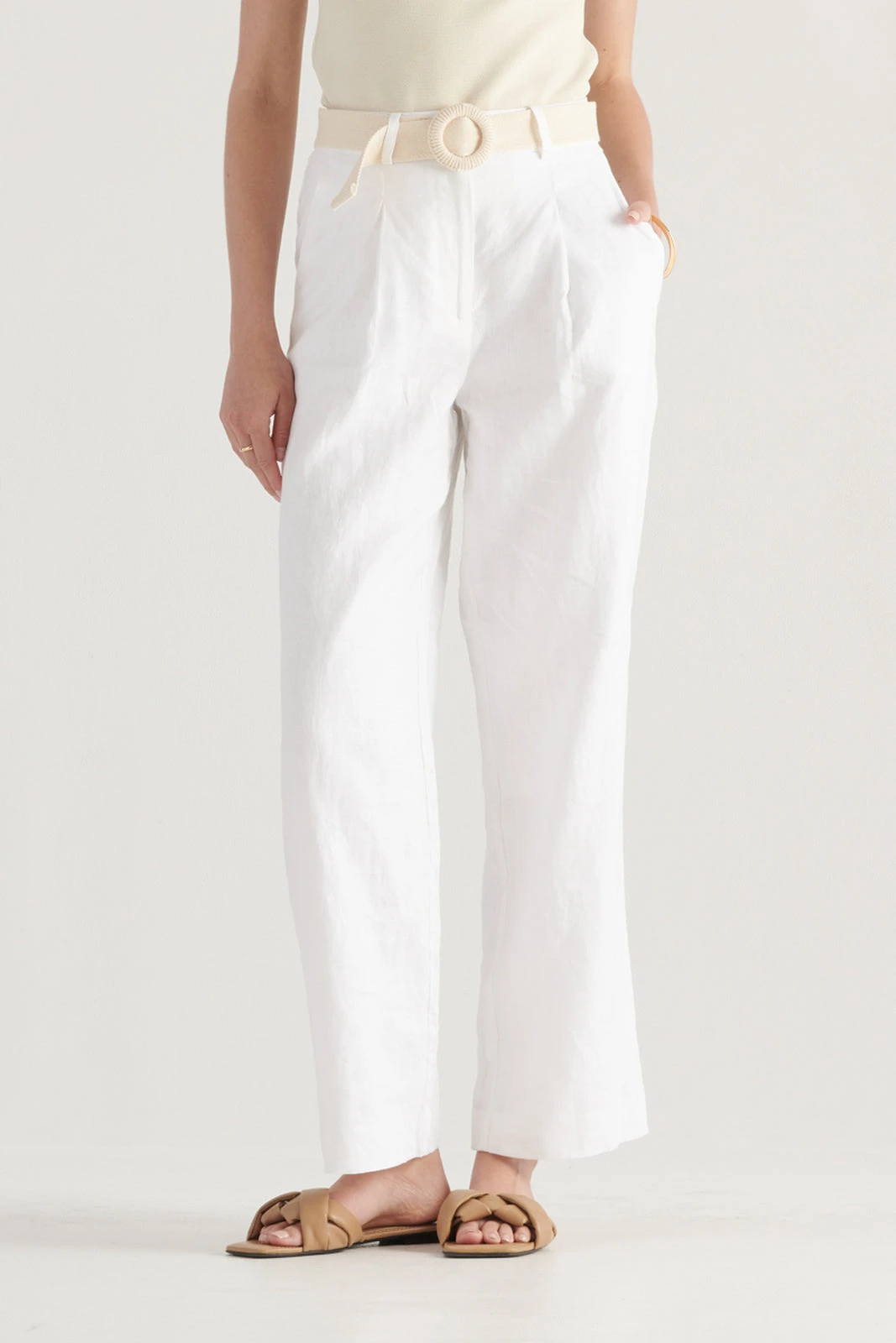 The Kimberley Pant from Elka is a sleek and stylish essential. Crafted with a tailored silhouette, these pants include a high waist, wide leg and front single pleats. Crafted from premium 100% linen, they are lined for full coverage. Perfect with a simple knit top, these pants add a fresh feel to your new season look.