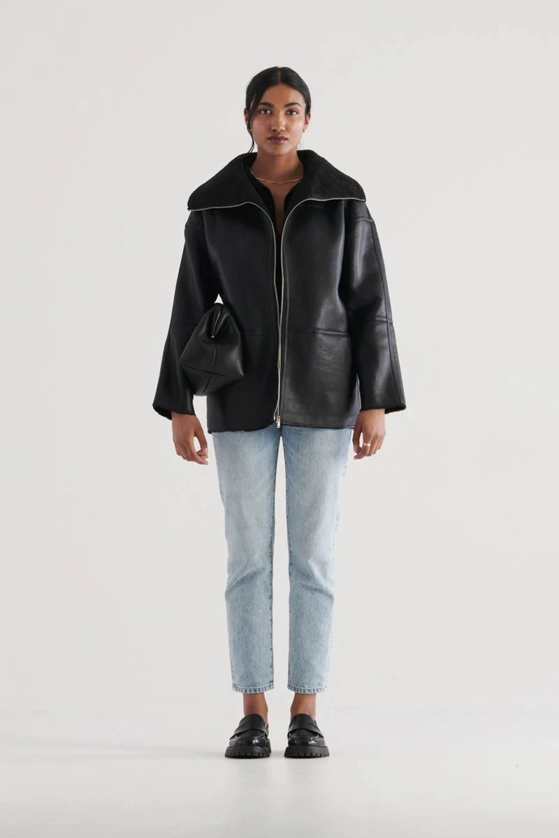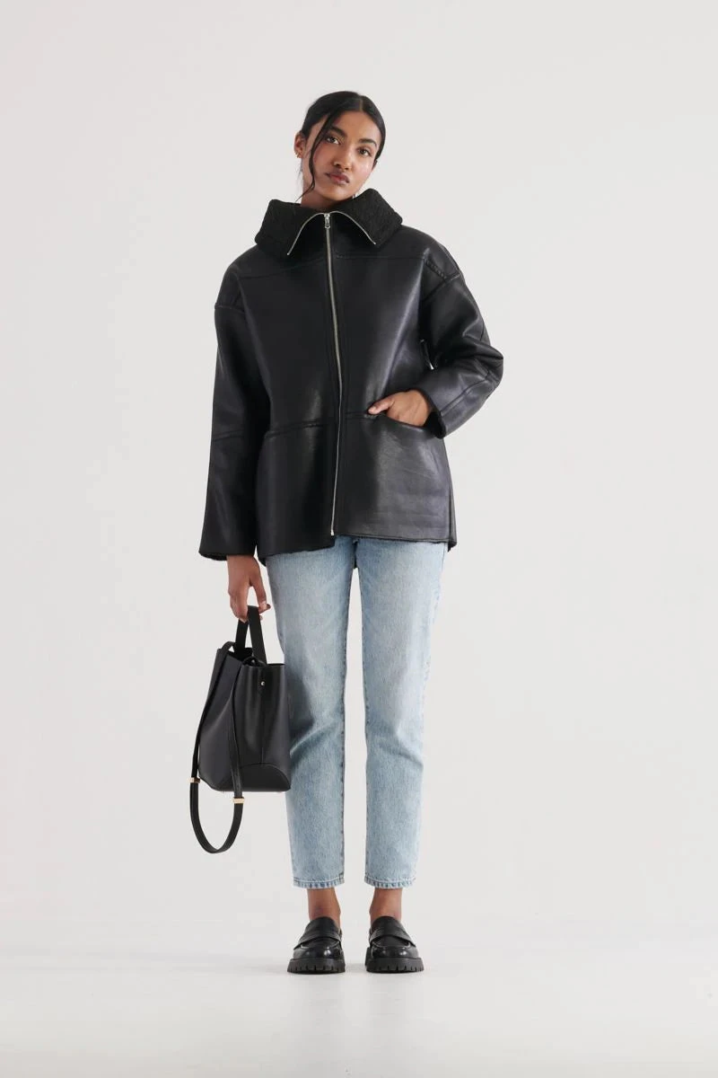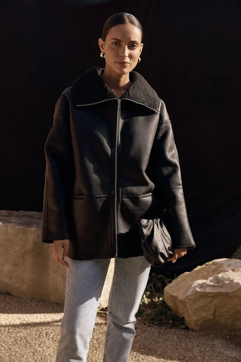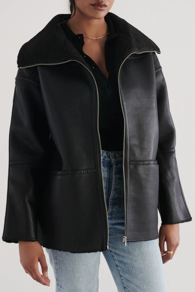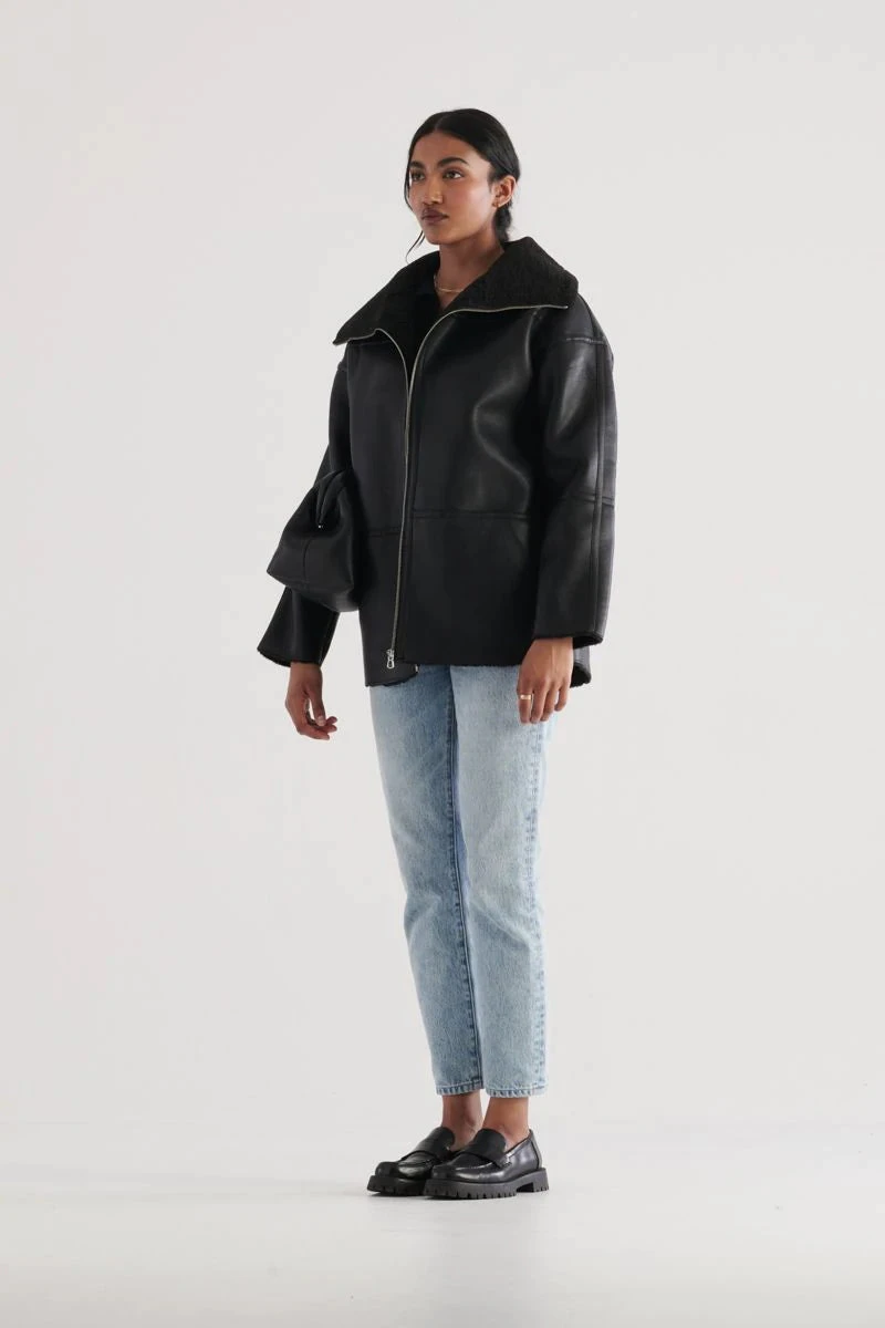 A timeless wardrobe piece worth the investment, the Michaela Jacket is crafted from a luxurious vegan shearling and shaped to an oversize boxy silhouette.
