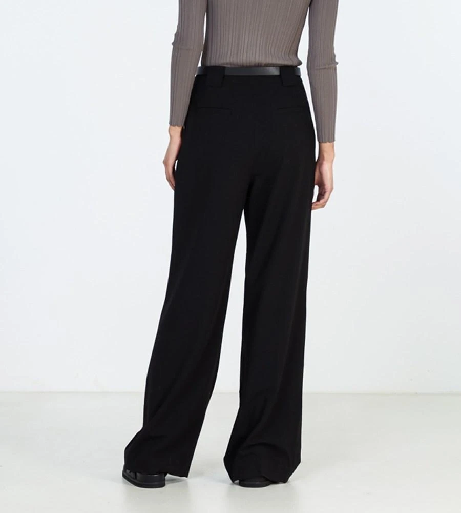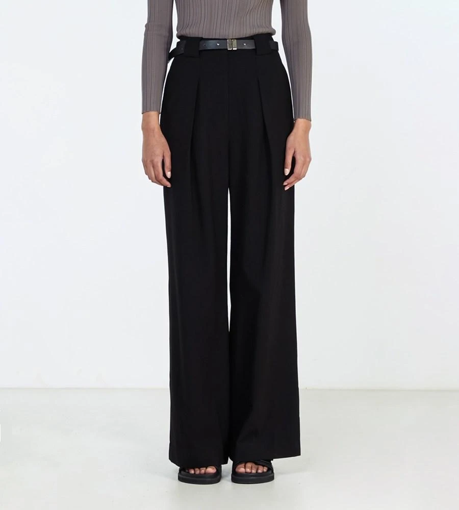 Elka Collective’s Tallinn pant features a wide leg fit, side pockets, front pleats and a custom vegan leather belt with soft gold metal trims. Pair with the fitted Paris knit tucked in or a white cotton basic.
