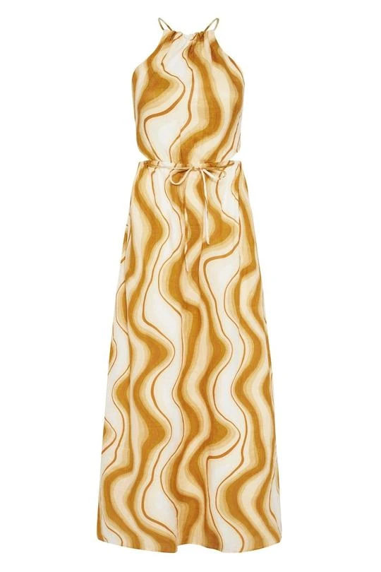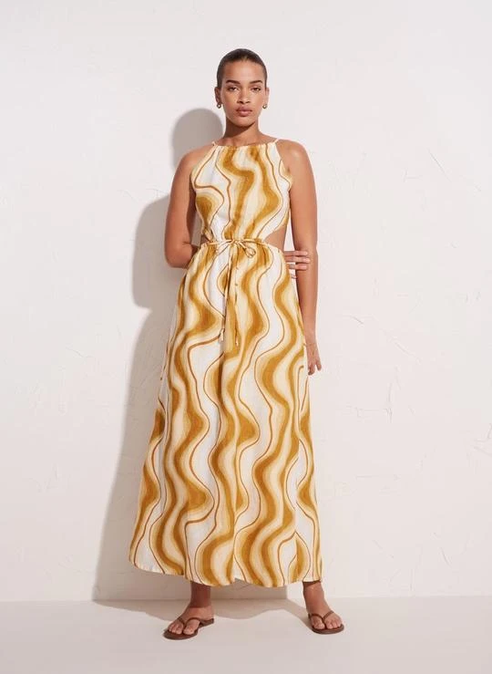 The La Piedra Maxi Dress is our special campaign syle, perfect to wear for an occasion or special event. Featuring a high neck with an open backline detail with adjustable ties, which can help to shorten or lengthen the dress. The waist is elasticated, secured by a tye which then falls into a gathered full length maxi skirt. Hand printed and hand dyed in our exclusive artisanal, tonal, abstract Talamanca print. Cut from a breathable linen, with certified sourced fibres, grown and cultivated in Normandy, France following the European Flax standard. This garment is fully lined.