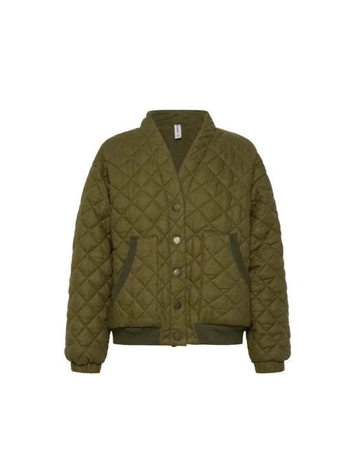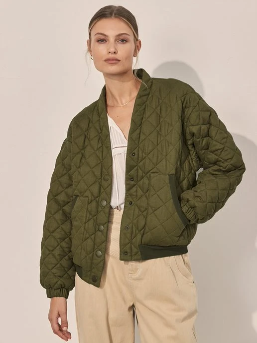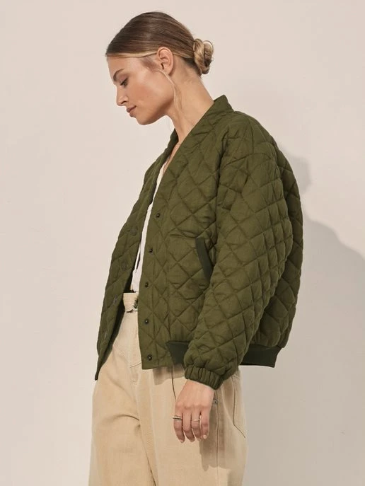 Crafted in a military green with a quilted, diamond top-stitch finish. The Vida Jacket features brass snap buttons, side pockets and elasticated cuffs.
