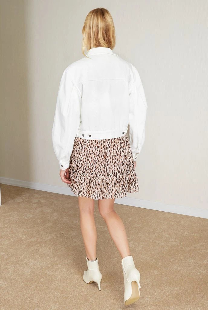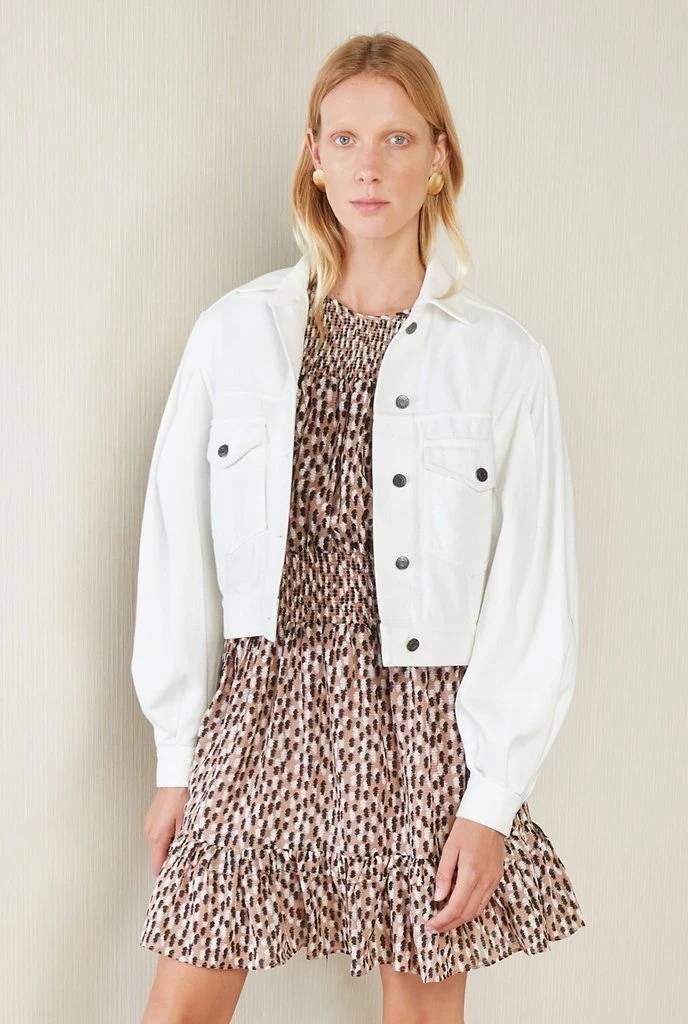 The Jasper Jacket is a semi-cropped denim style, featuring statement balloon sleeves and metallic button details adorning the front of the jacket, chest pocket flap closures, cuffs, and waist. The jacket is designed with drop shoulders and a classic denim jacket collar.
