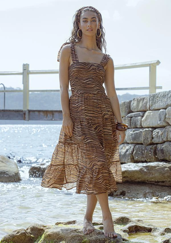 Ministry of Style’s Tigress Strap Midi Dress is fitted with tie shoulder straps for a bohemian look. It’s crafted from our signature tigress print with a fitted bodice, then flared to a full tiered skirt. Style it for the evening with statement sandals and a clutch.