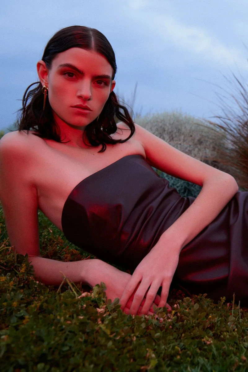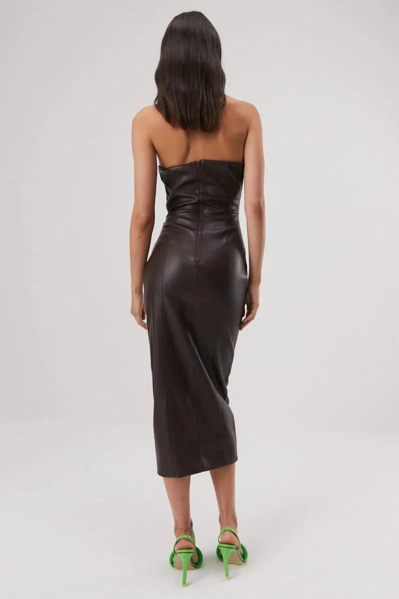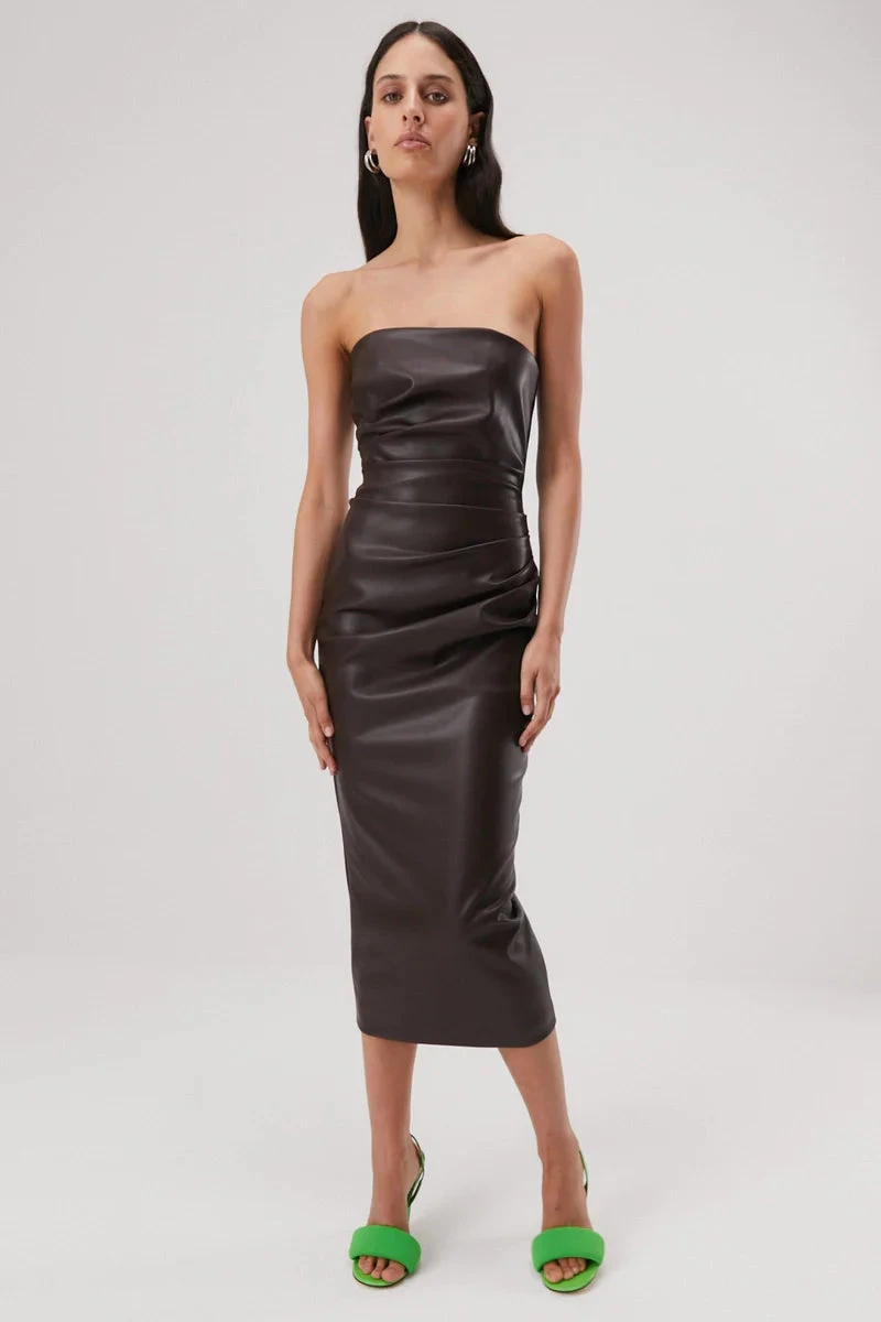 Introducing Griffin, a striking strapless mini dress crafted from a light-catching PU fabrication. Detailed with central boning for additional shape.