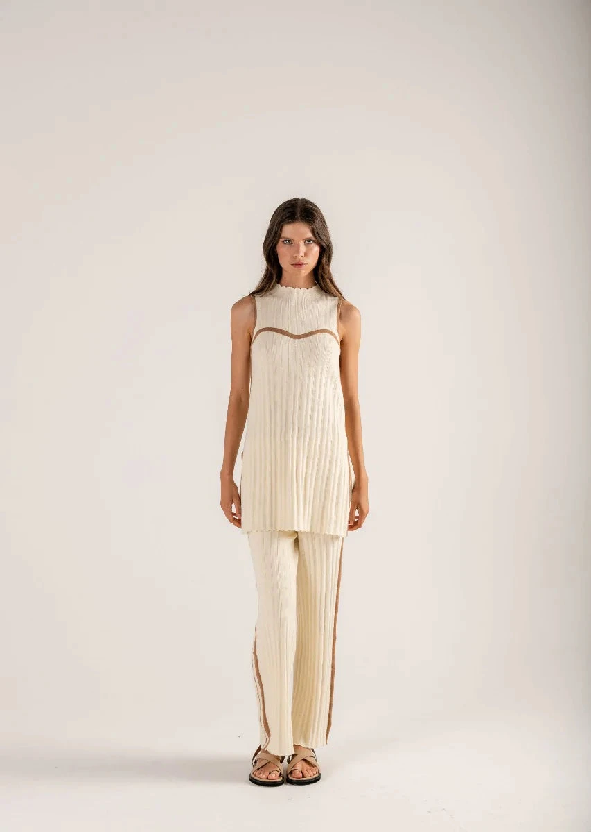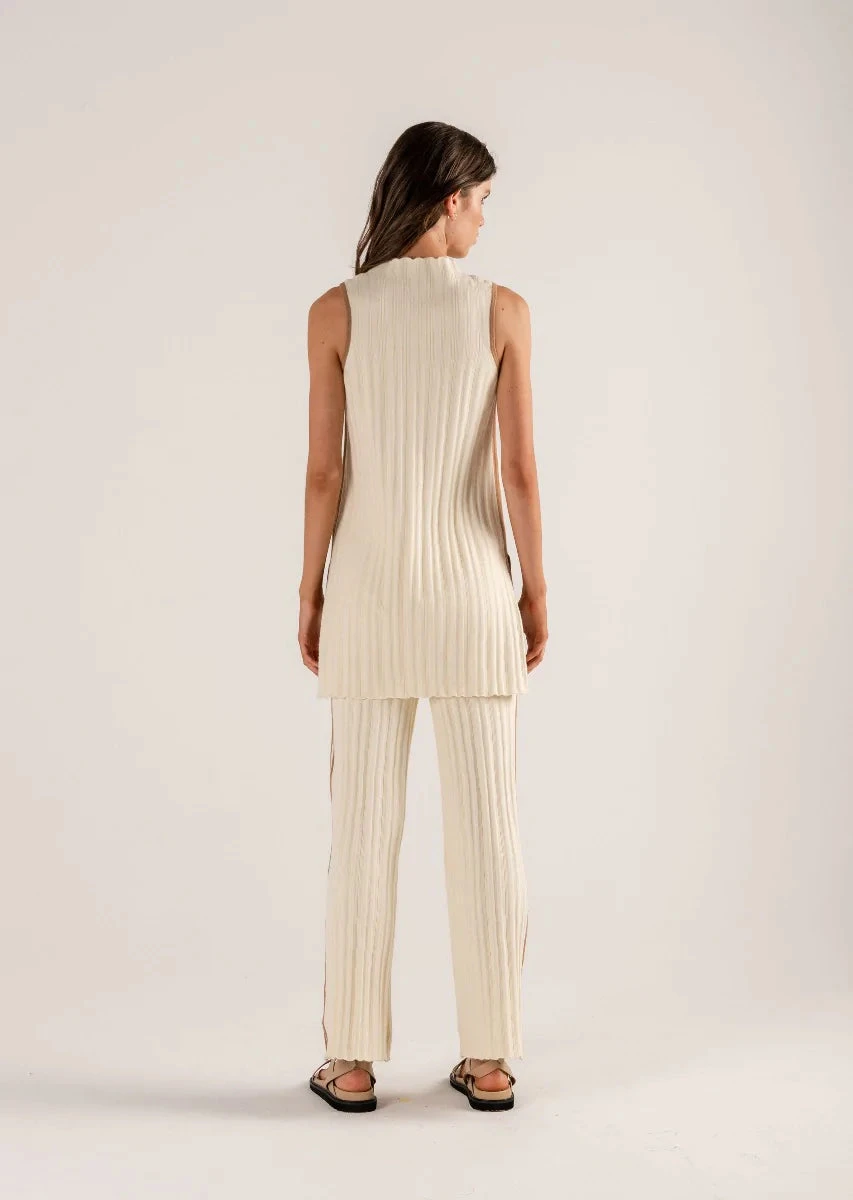 Fusing comfort and style, the Lyon Knit Pant from Mon Renn are a full length plisse knit pant with elasticated waist. Features contrast rib detailing down outside leg. Pair with the Lyon Tunic for a cohesive look.