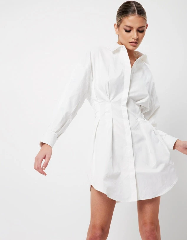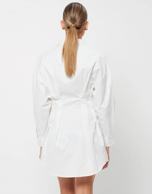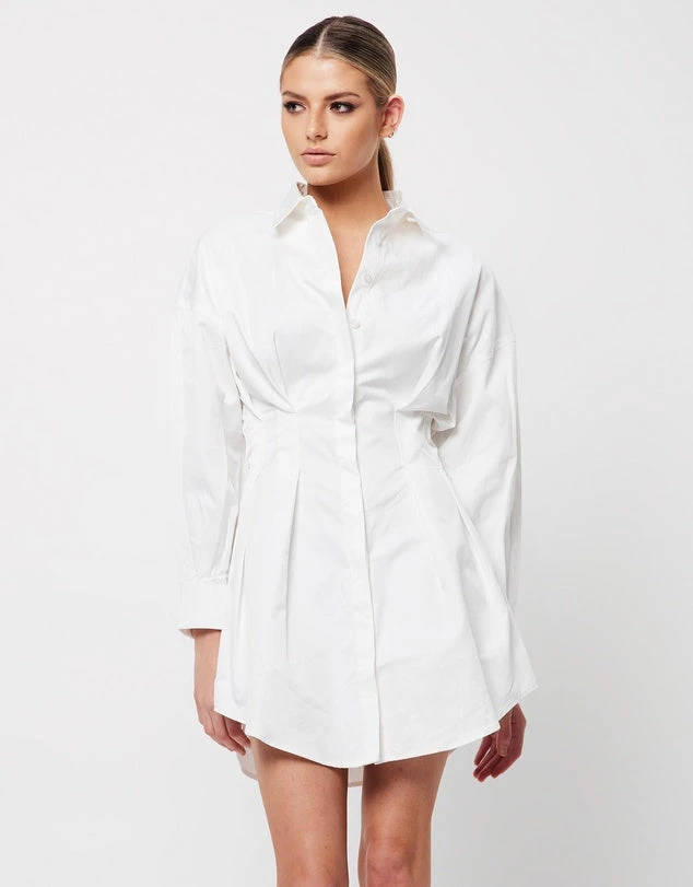 Rework your weekend edit with this season’s most coveted shirt dress. The New Light Dress offers a contemporary balance between chic femininity and architectural design. Emphasizing a cinched waist with pin tucking details, this mini is designed to flatter the feminine frame.