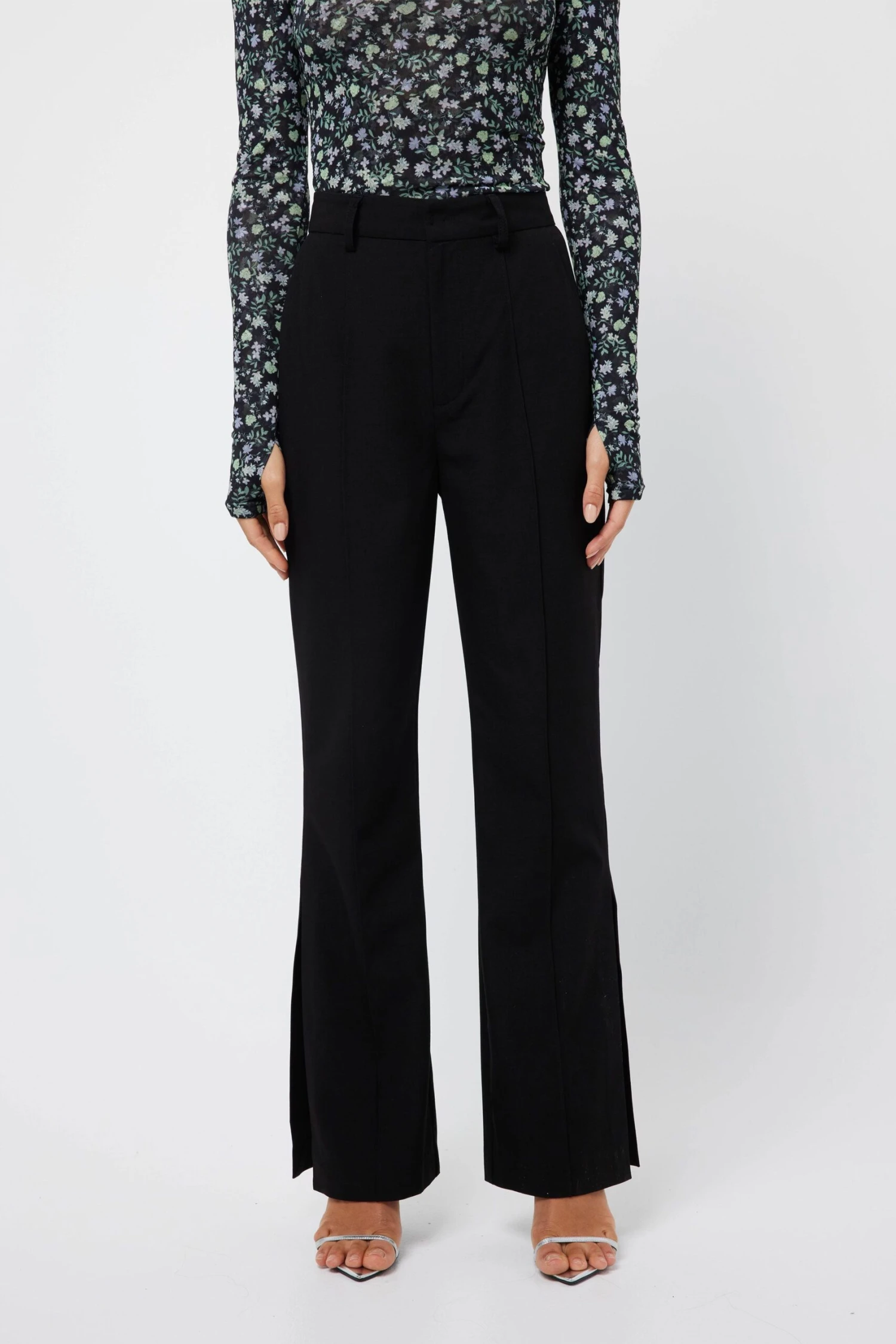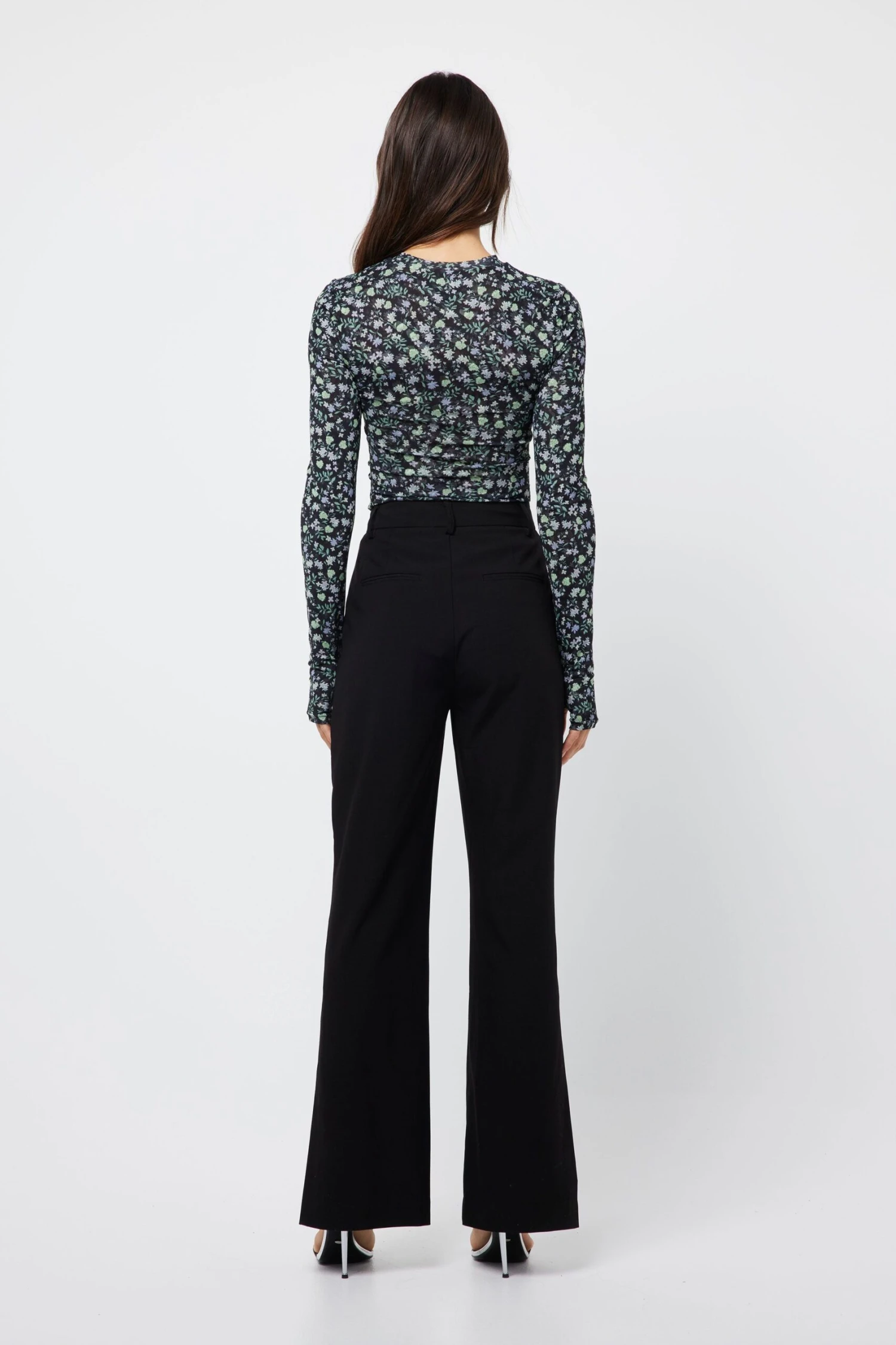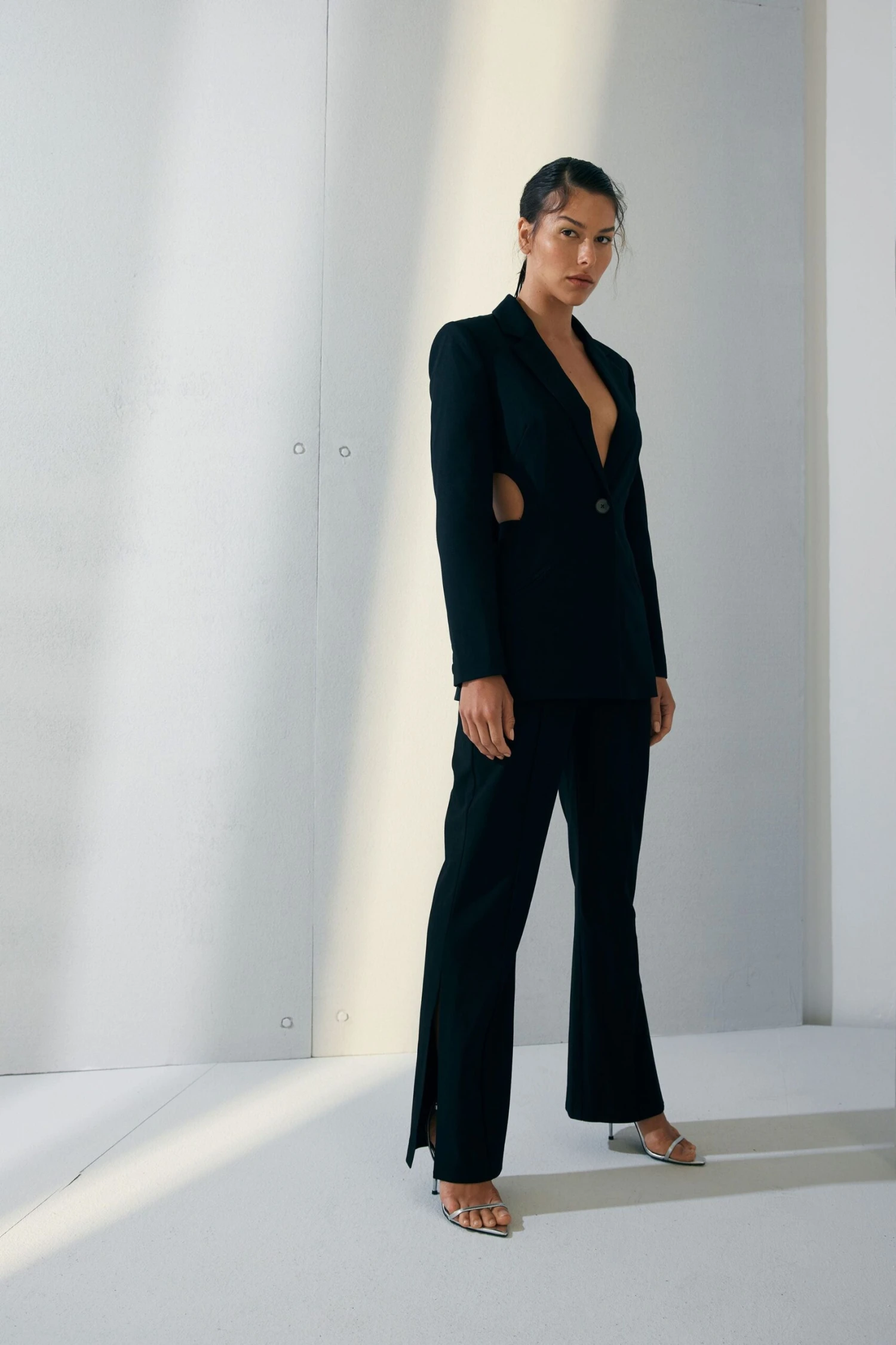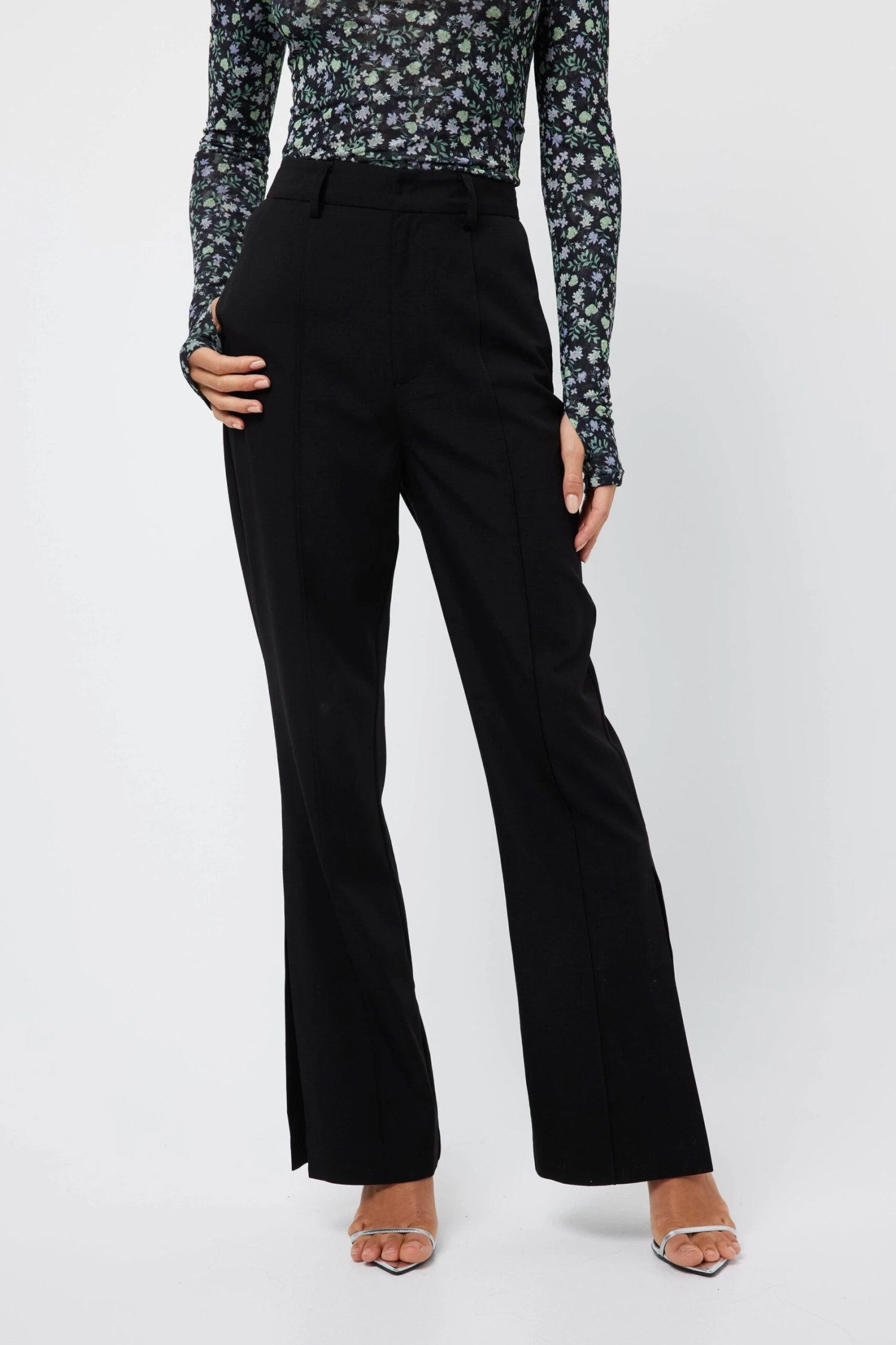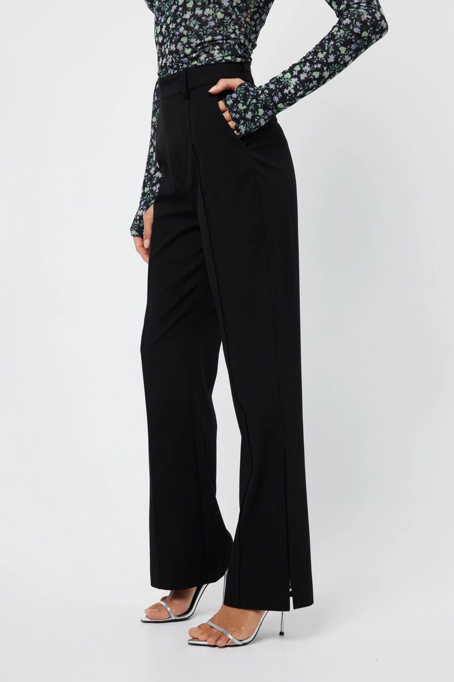 The Hold The Line Pant features a bold flared leg design in a classic black hue. Showcasing a fit and flare silhouette with a flattering high waist rise and ankle splits, this pant is perfect for your next formal occasion. Wear with The Sublime Top to elevate this staple evening pant.