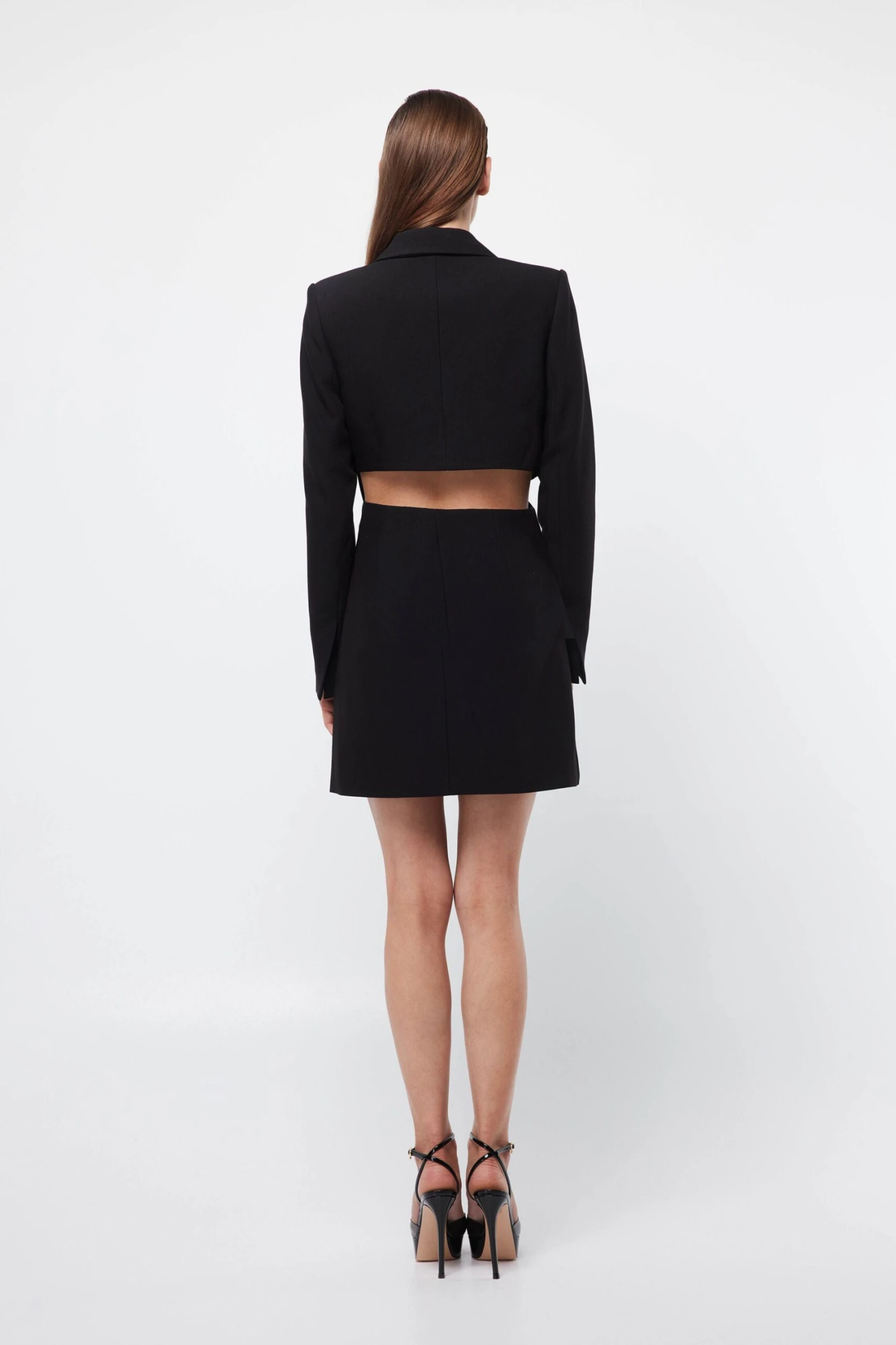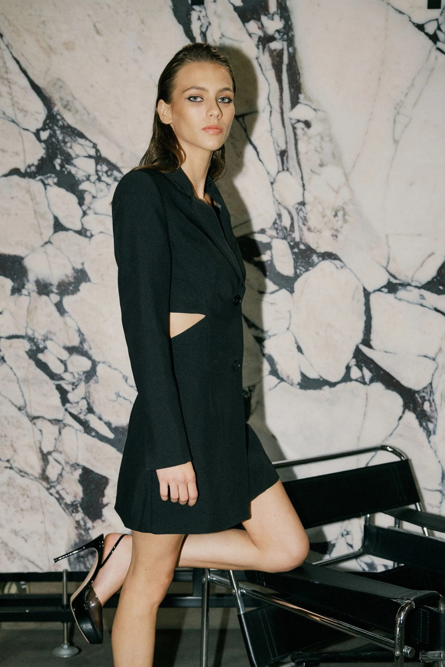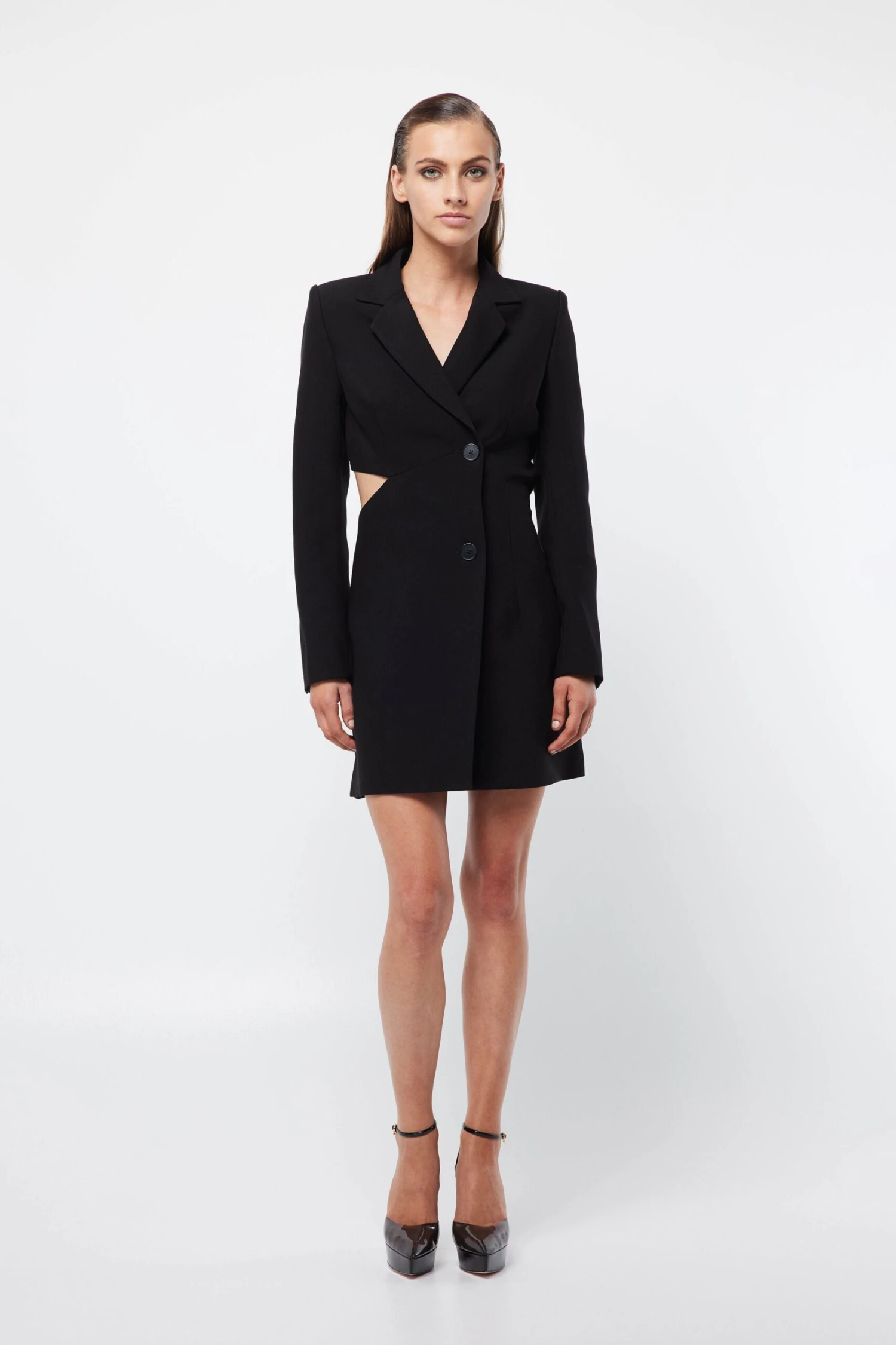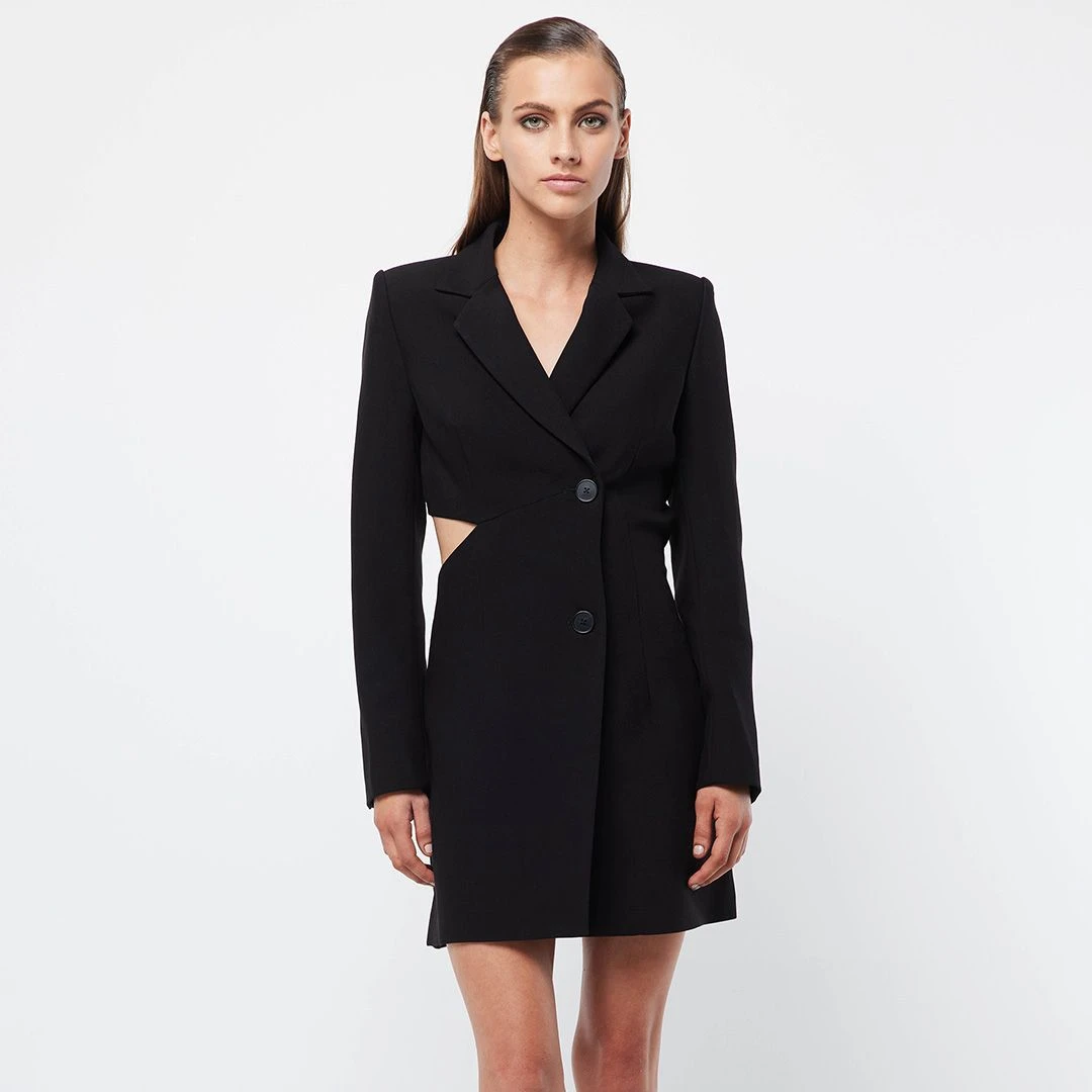 Tailored with modern touches, the Meet Again Blazer Dress is both classic and fashion forward. The off-centre button closures and geometric waist to back cut out add contemporary edge to this blazer dress, while the shoulder pads create a sophisticated look. Wear with a sharp heel for your next occasion.