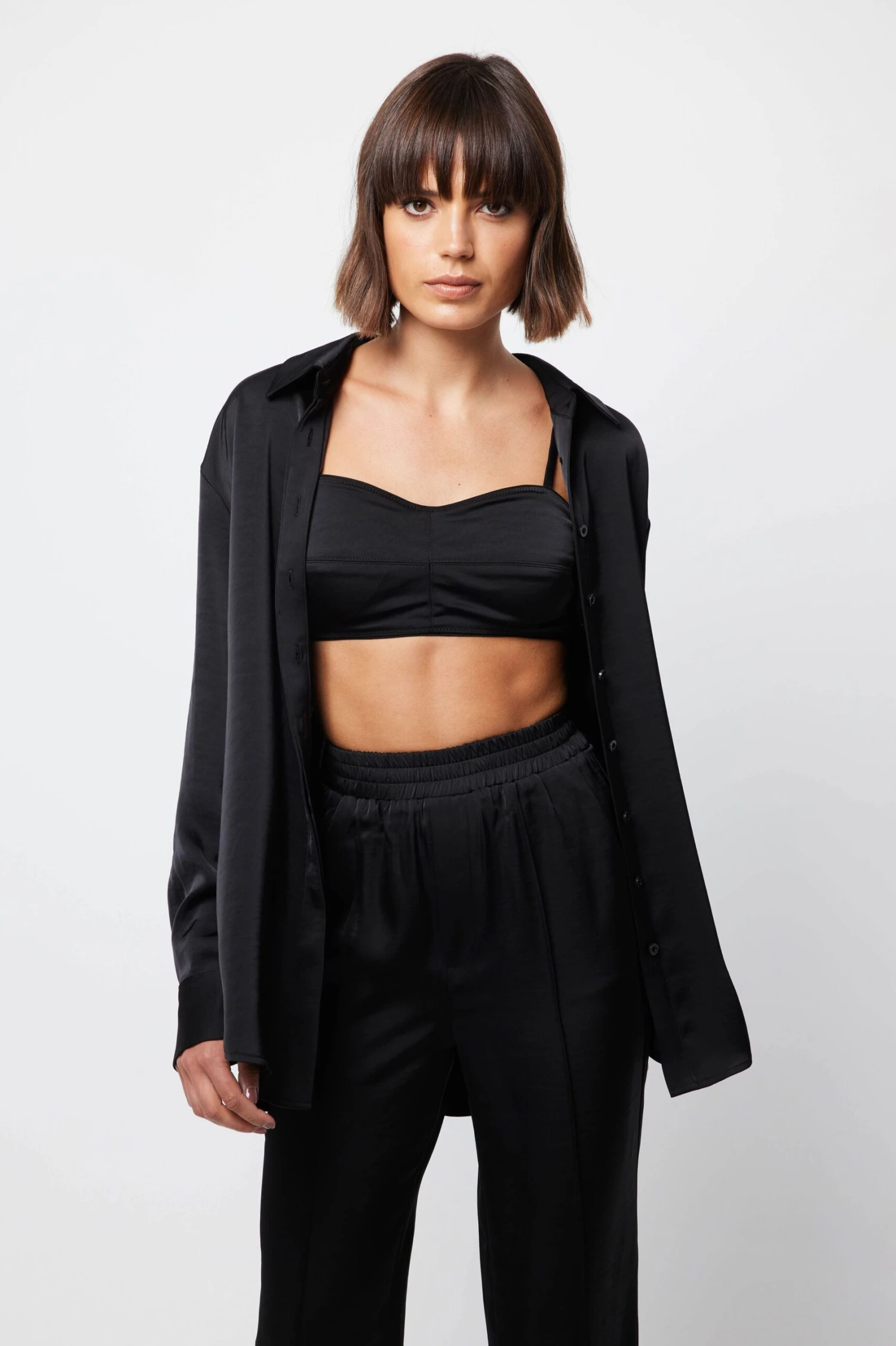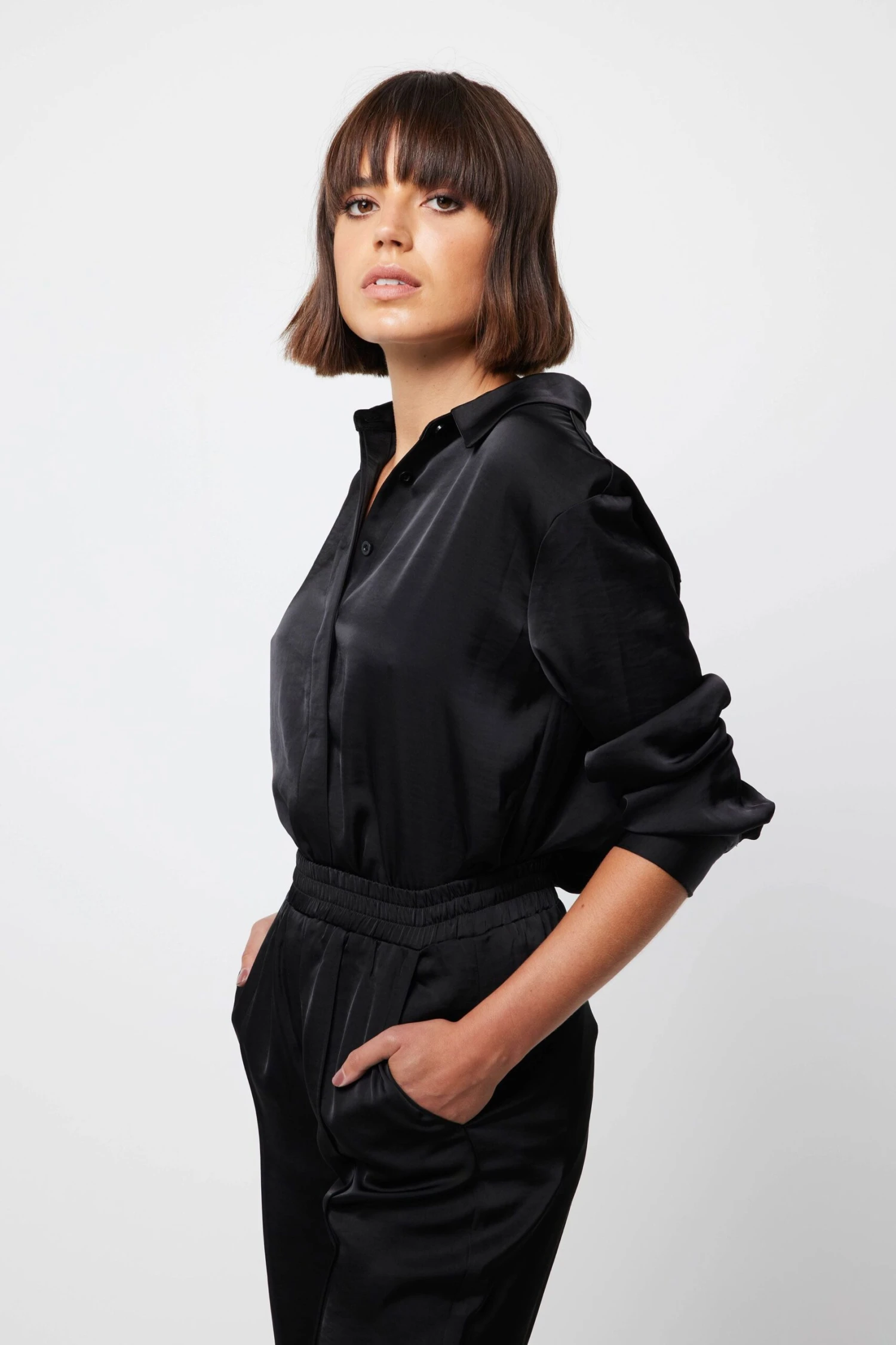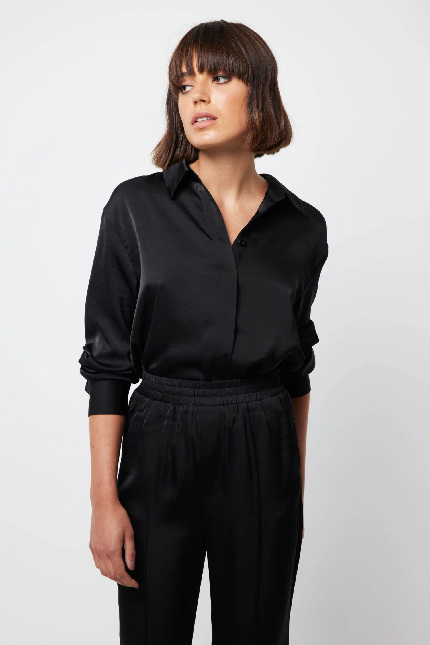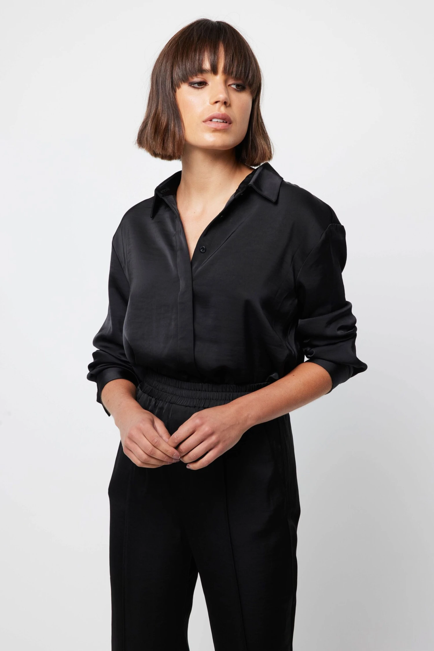 Feel cool and classy in The Colossal Shirt. Crafted from a satin sheen fabrication in black, this piece showcases a collared neckline, long sleeves with cuffs and a relaxed silhouette. For a chic ensemble, style with The Colossal Pant.