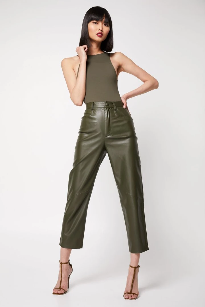 The Infinite Pant will quickly become a wardrobe favourite. Designed with a high quality faux leather in an on trend Olive tone, rectangular pockets and carefully placed design lines to help create an edge to a basic pant silhouette. Pair with The Infinite Top for the complete set