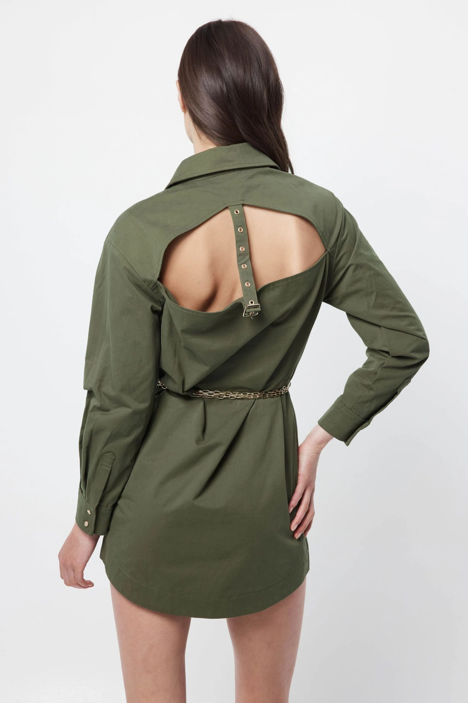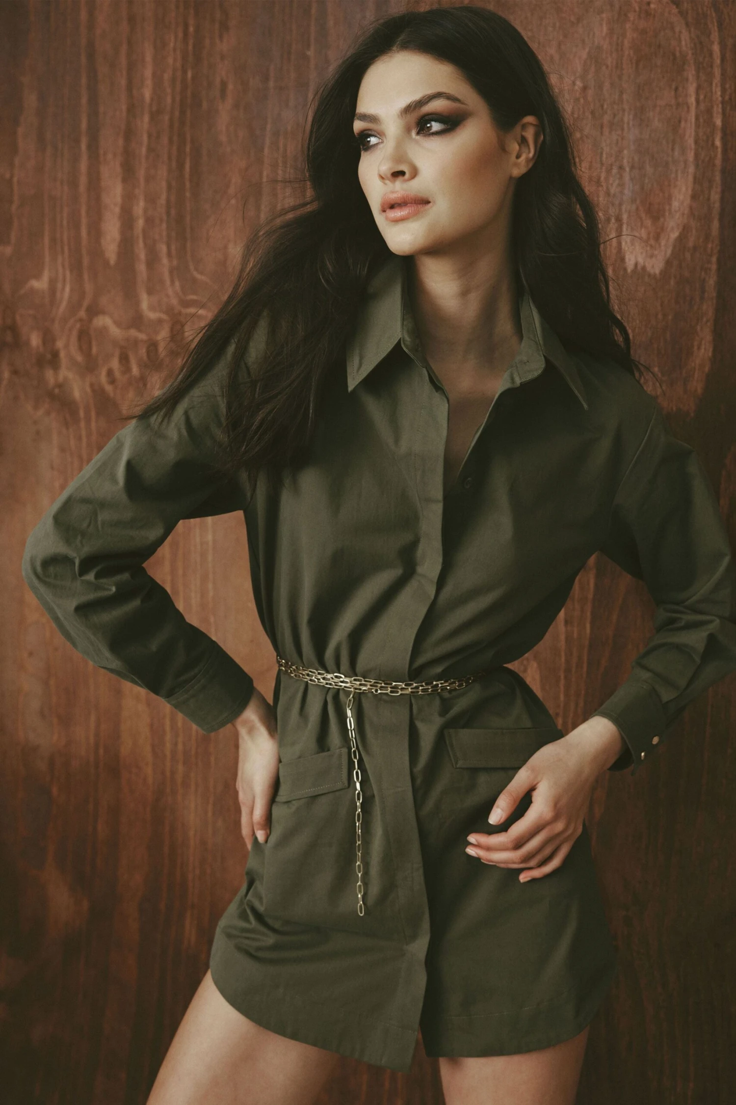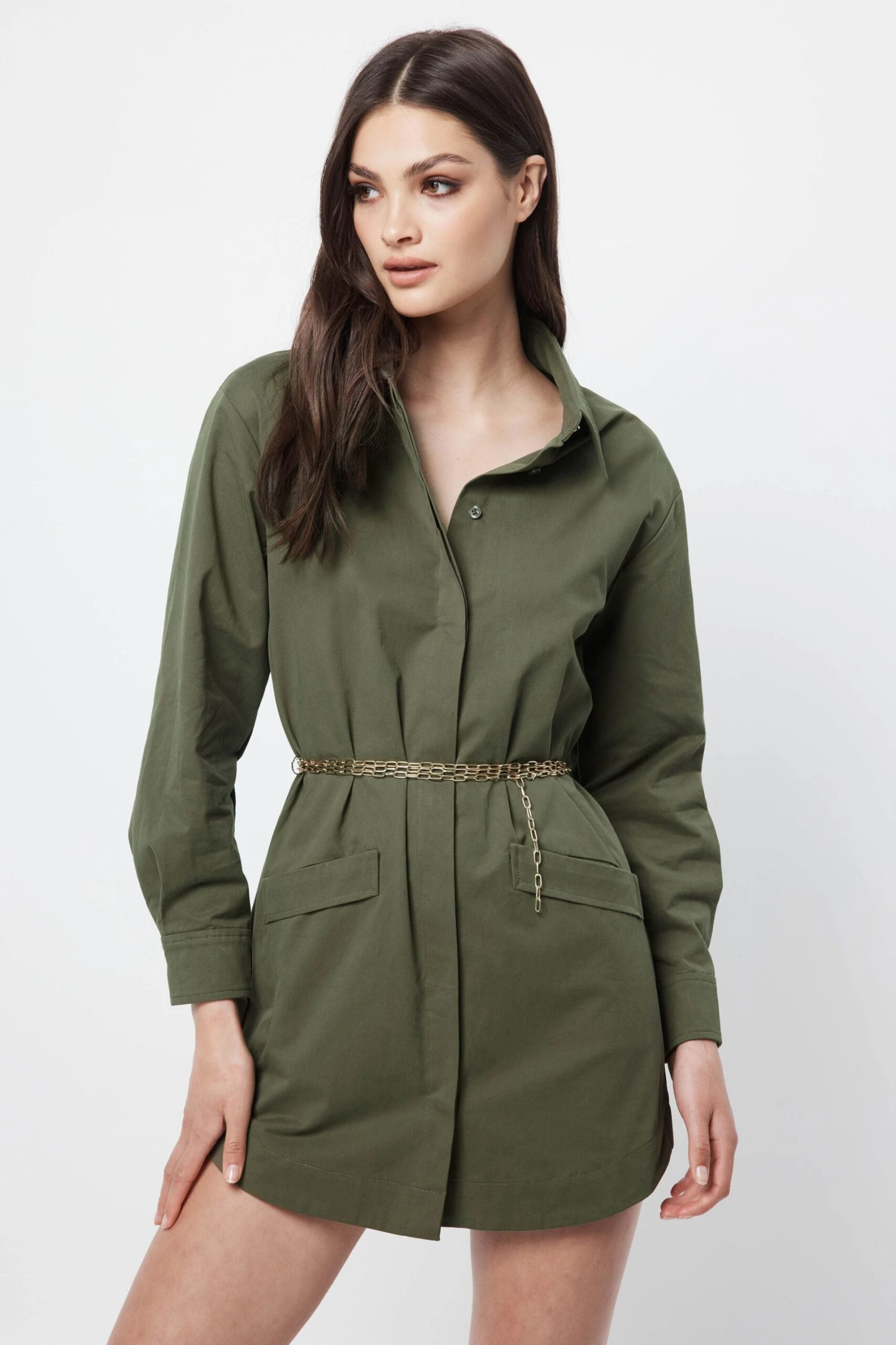 The Visionary Shirt Dress offers a contemporary balance between chic femininity and architectural design in our new Moss colour way. Emphasising a gold detailed waist feature, with two front waist pockets. This mini is designed to flatter the feminine frame and fit effortlessly into your wardrobe.