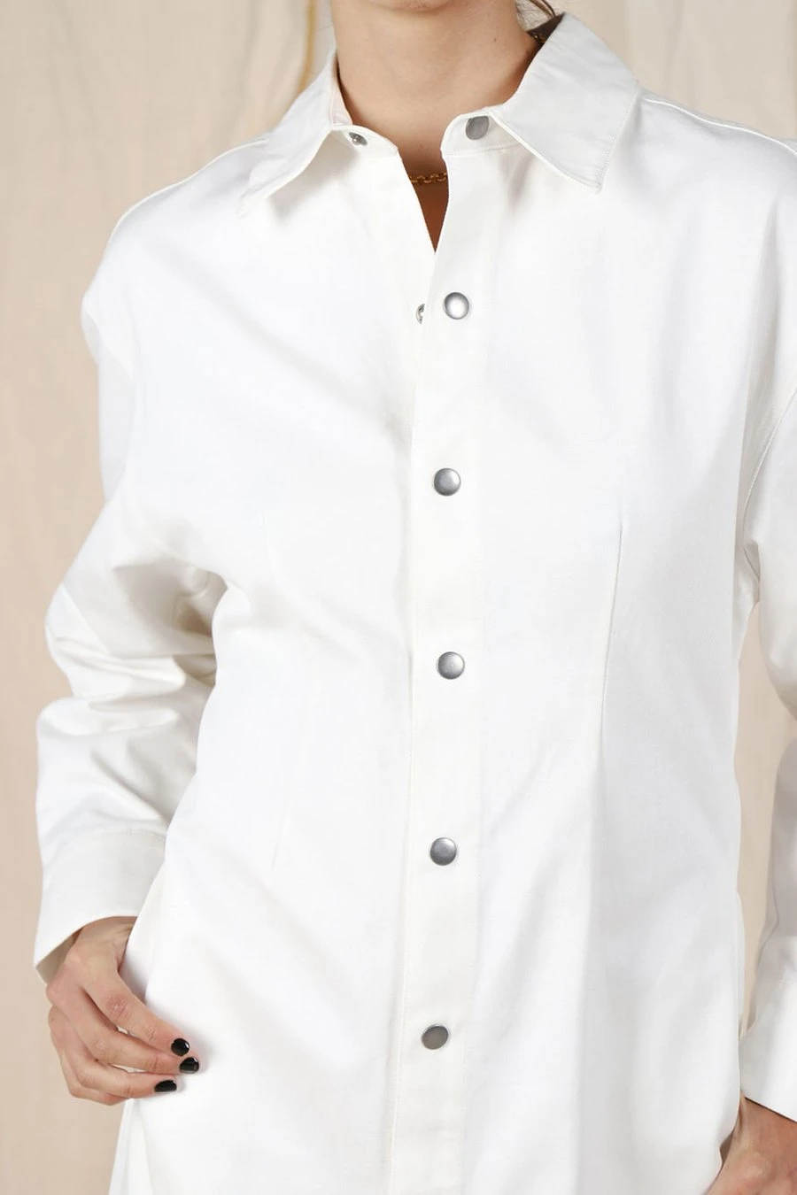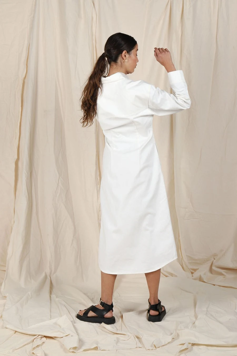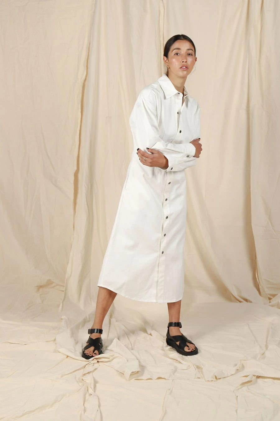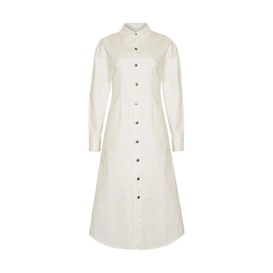 Equal parts comfortable and polished, the North dress features a point collar, a clean snap button front, and a versatile midi length, this sleek staple can be dressed up and dressed down by pairing chunky sneakers to create a casual cool look for any occasion.
