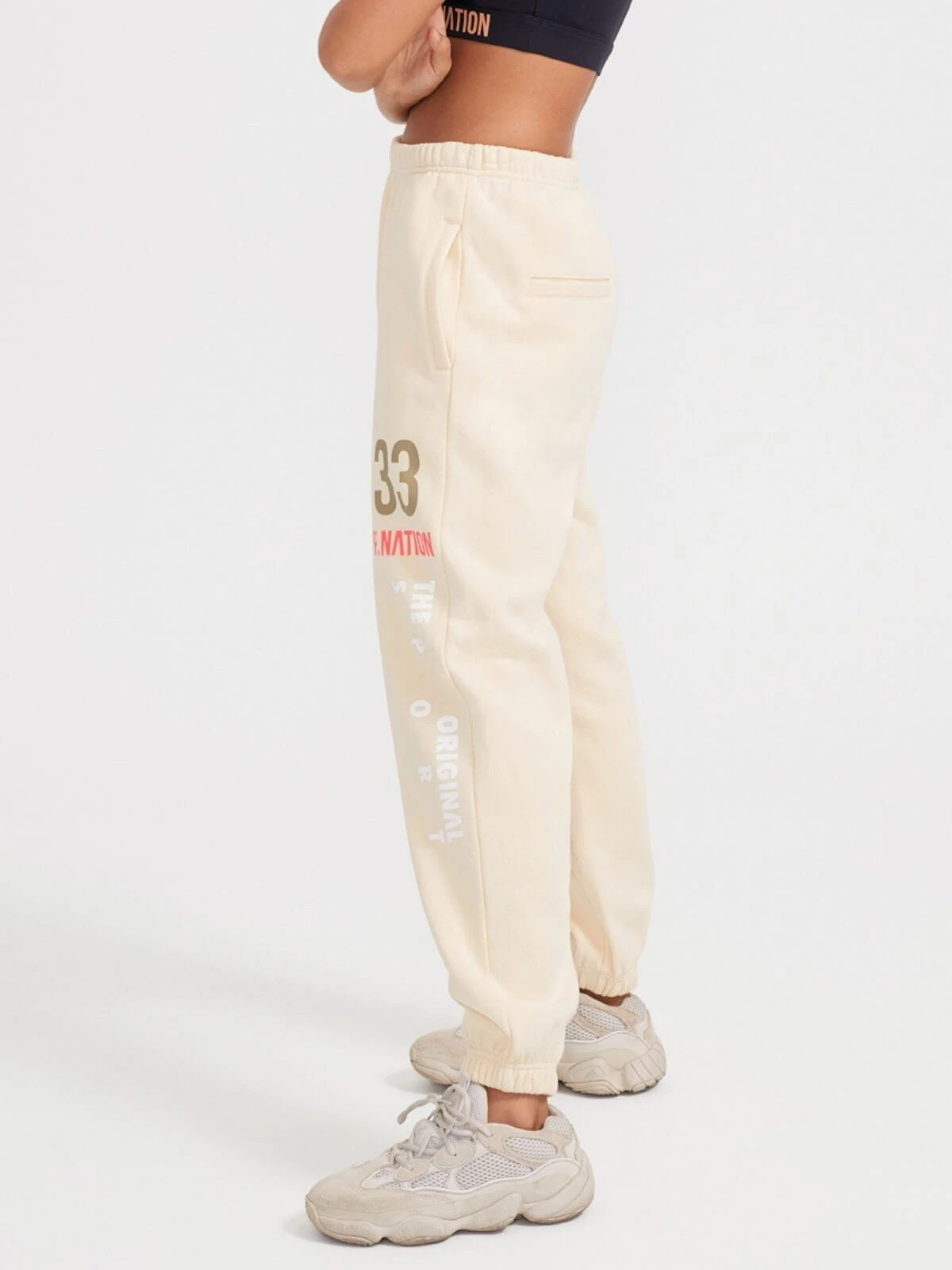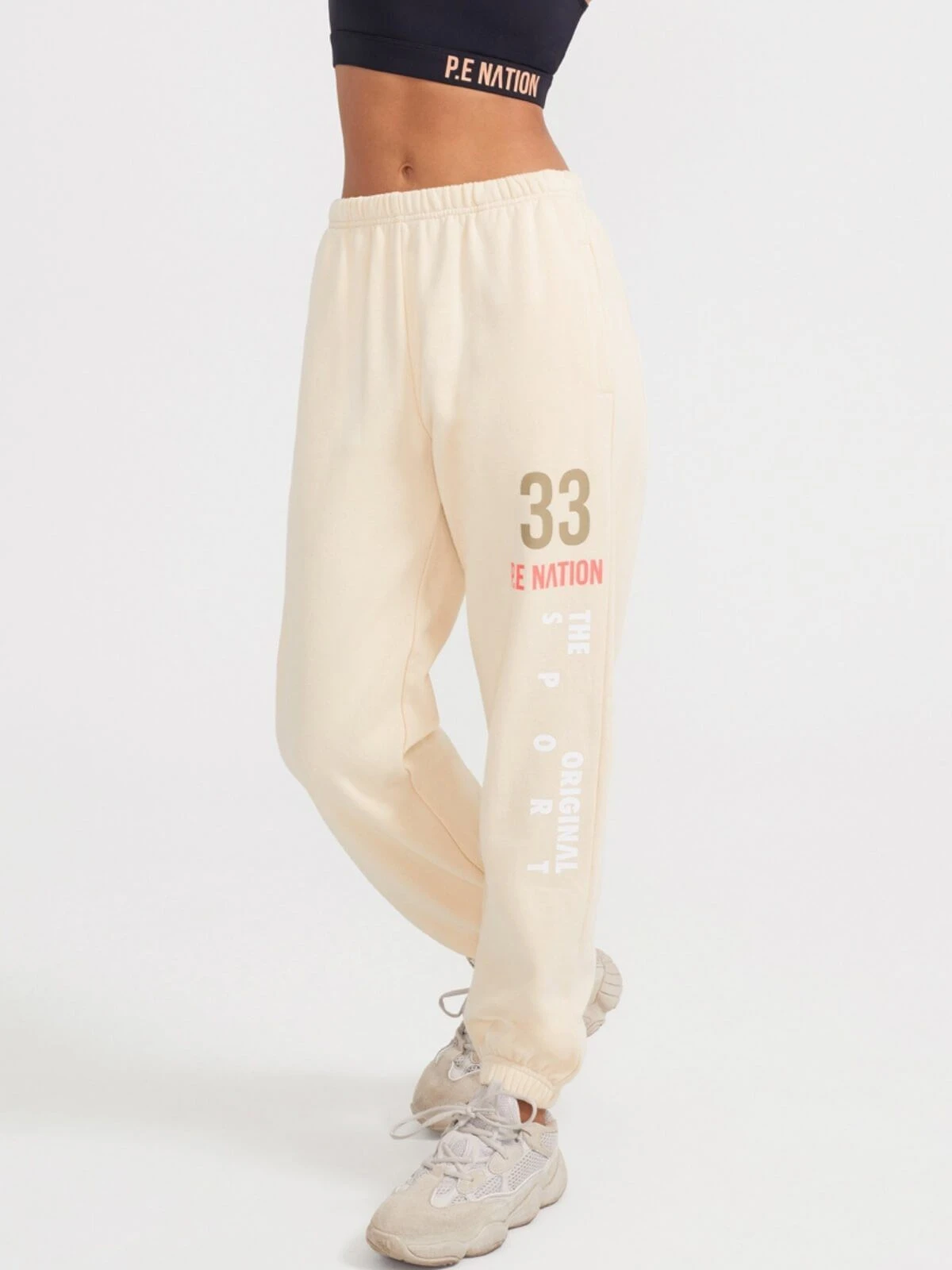 The Triple Double Pant in Ivory comes as part of the Work It Downtown Collection. A hyper-soft midweight sweatpant cut from an organic cotton and hemp blend with a brushed fleece finish. Tapered ankle-length style for an easy yet elevated off-duty look makes the Triple Double Pant a pre- and post-training essential, and perfect for recovery days. Featuring an elasticated waistband with drawcord, welt pockets at the front and back, and contrast P.E Nation flat rubber logo on the side leg for an effortless street-sport statement. Pair with the Triple Double Sweat for tone on tone appeal.