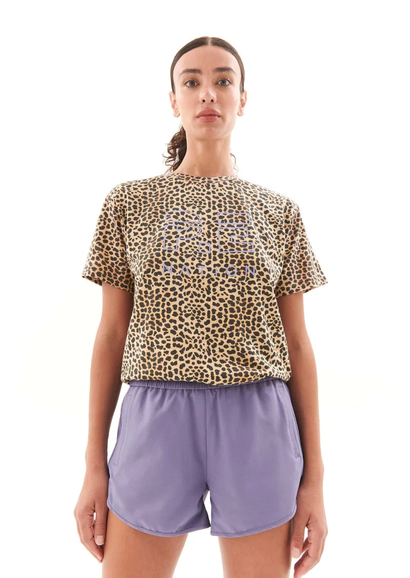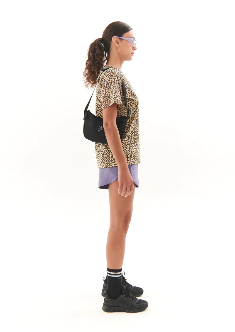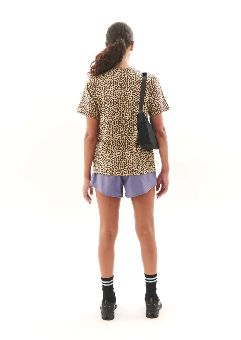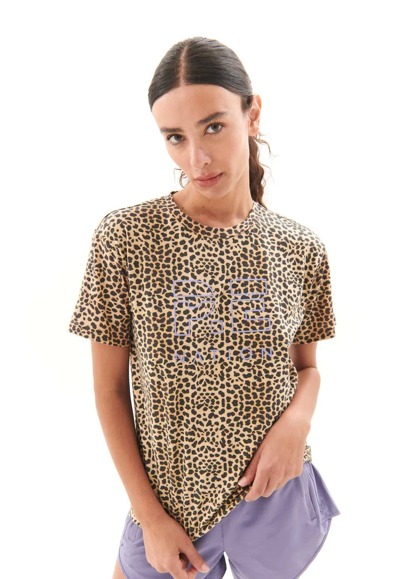 Designed in a soft and sustainable lightweight blend of cotton and hemp, the Del Mar Tee is cut in an all over animal print to help you stand out from the crowd. Complemented by a subtle flat rubber P.E Nation logo print on the front. Ideal for your street-sport and lifestyle wardrobe, style yours over the Del Mar Sports Bra and the Del Mar Bike Short, Stadium Legging or Reverb Short in Optic White.
