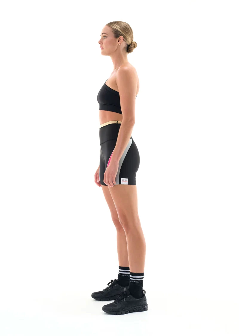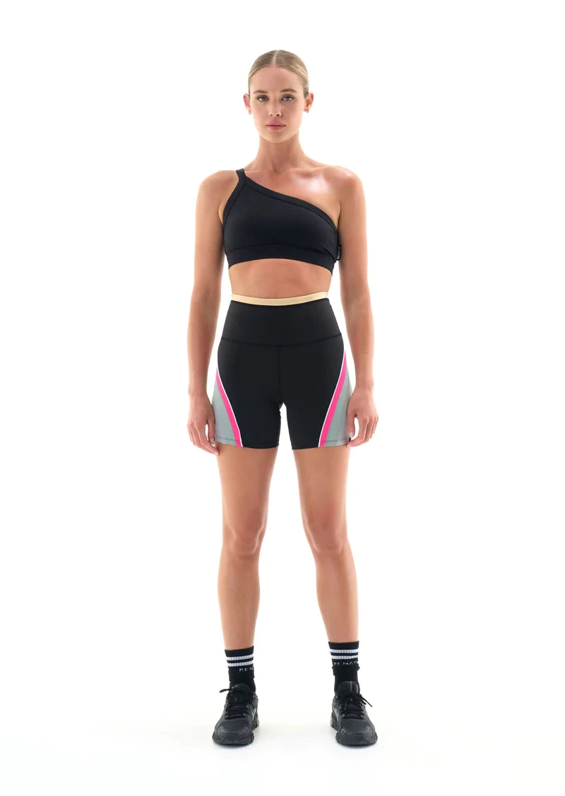 The Division One Pilates Bike Short in Black comes as part of our Varsity Muse Collection, a full out homage to 90s sportswear, focusing on baggy silhouettes, collegiate prints and nostalgia-driven aesthetic. Made from soft recycled tech matte fabrication, the Division One Bike Short is built for low impact training, including Pilates, yoga and barre. Built in waistband support is matched with squat proof coverage and minimum seams. Curved colour block panelling, contrast piping and contrast waistband bring signature P.E appeal. A small P.E Nation woven logo patch sits at the hem. We recommend styling it with the Valley Sports Bra, Layup Sports Bra, Azzurra Sports Bra, Perfect Score Tank in Pink Glo and Shuffle Tank in Beige.