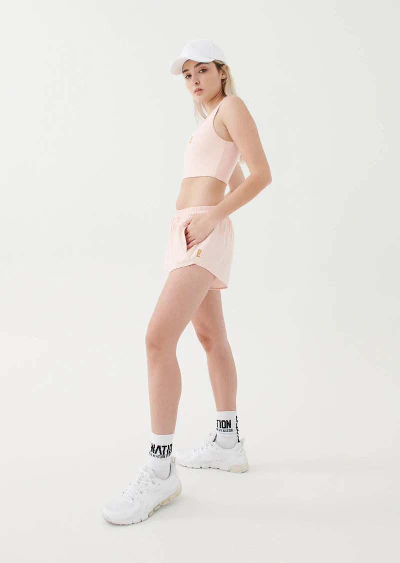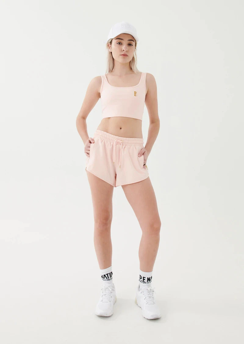 The Full Time Short in Candy comes as part of our It’s All In Me Collection. A relaxed fit style designed to sit mid-waist, the Full Time Short has an internal brief and features a premium 92% recycled fabrication for feelgood athleticwear with an elevated aesthetic. An elasticated waistband includes a functional drawcord with gold-plated hardware. Side pockets at the front and a zippered back pocket add extra storage and style options. A reflective P.E Nation logo sits to the side for signature street-sport appeal.