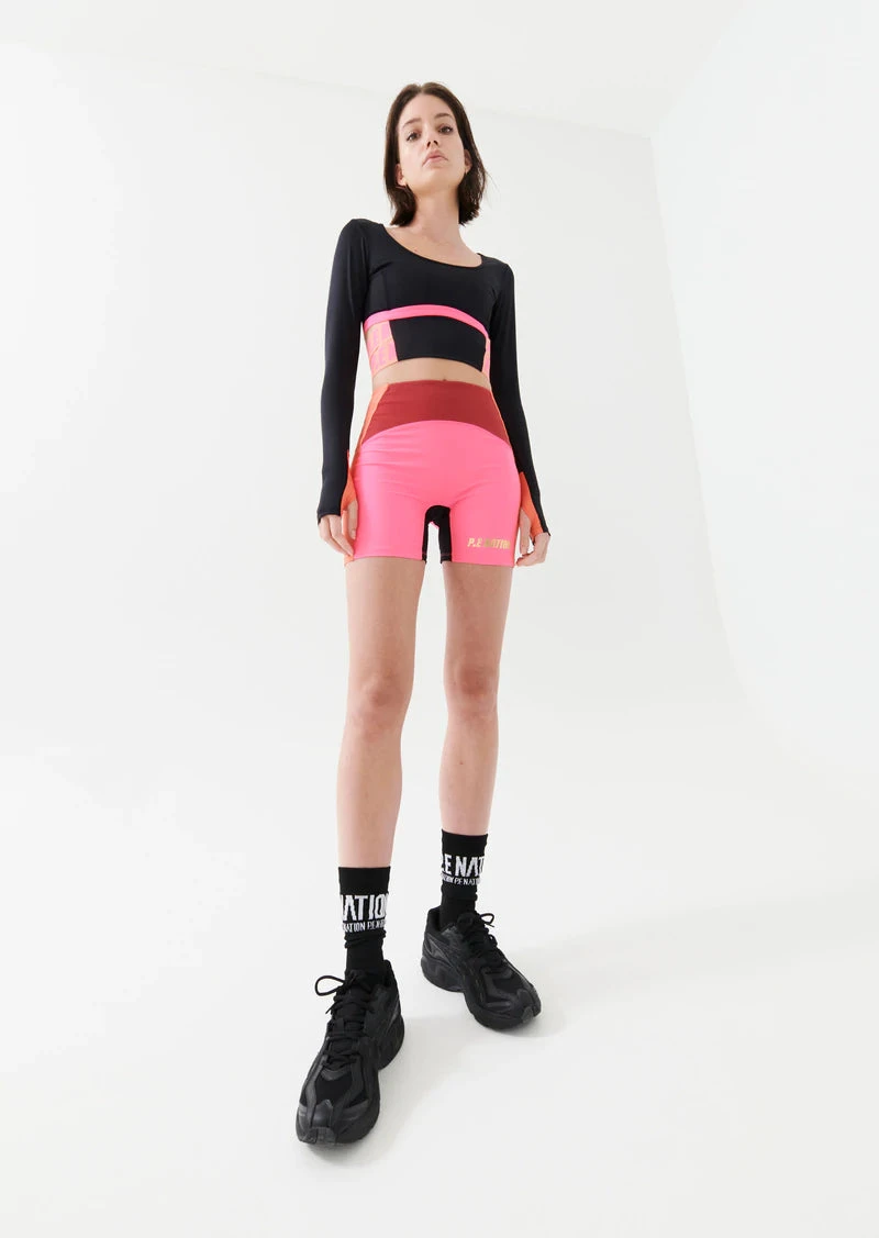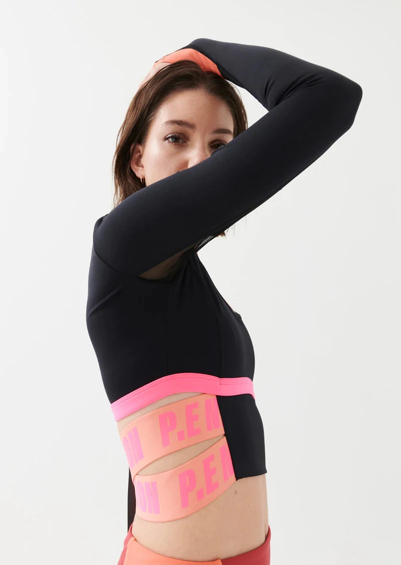 The High Press Top in Black comes as part of our It’s All In Me Collection. A fitted long sleeve active top in matter sustainable activewear fabrication, the High Press Top features a low scoop neckline at front with contrast fluro trim at the true waist. Power mesh panelling along the sleeve is matched with contrast pink colour block with thumbholes at the cuffs. A criss-cross P.E Nation fluro woven jacquard waistband elevates this perfect-for-Pilates studio separate. Team it with the High Press Legging, Double Under Legging, or Fluid Short.