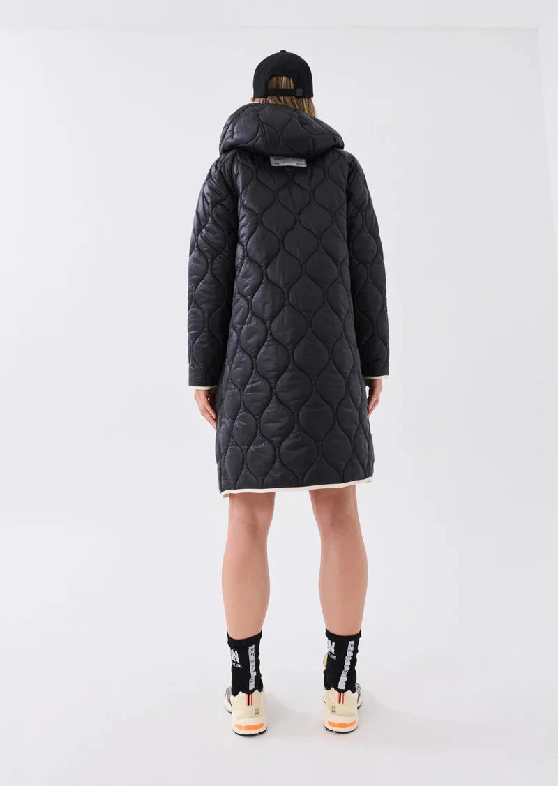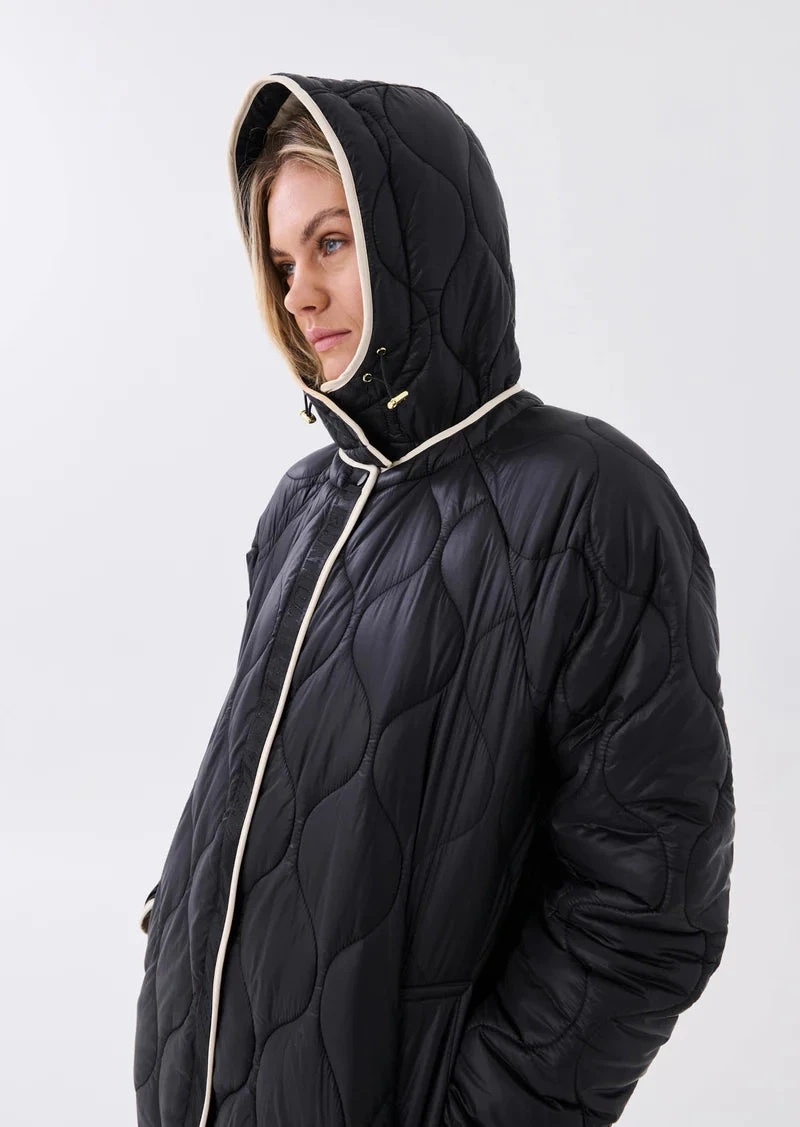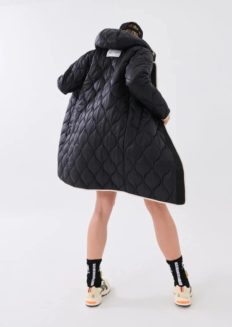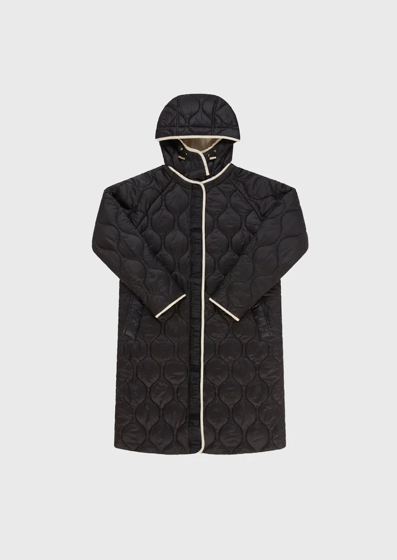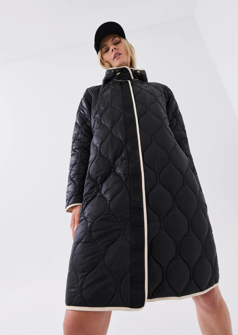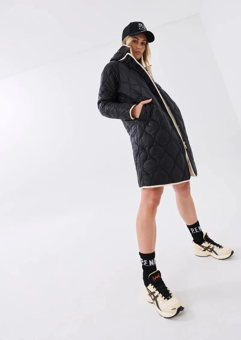 The Hudson Jacket in Black comes as part of our Mainline Collection. An elevated addition to your outerwear collection, this longline jacket showcases a quilted panelling texture. The black exterior is contrasted by the beige interior and P.E branded jacquard down the centre front. Complimented by a generous removable hood, side pockets and stitched P.E Nation logo at the top back. Wear open or closed with a concealed centre front zip. Style with your favourite P.E pieces all year long or with the Reformer Top and Reformer Bike Short.