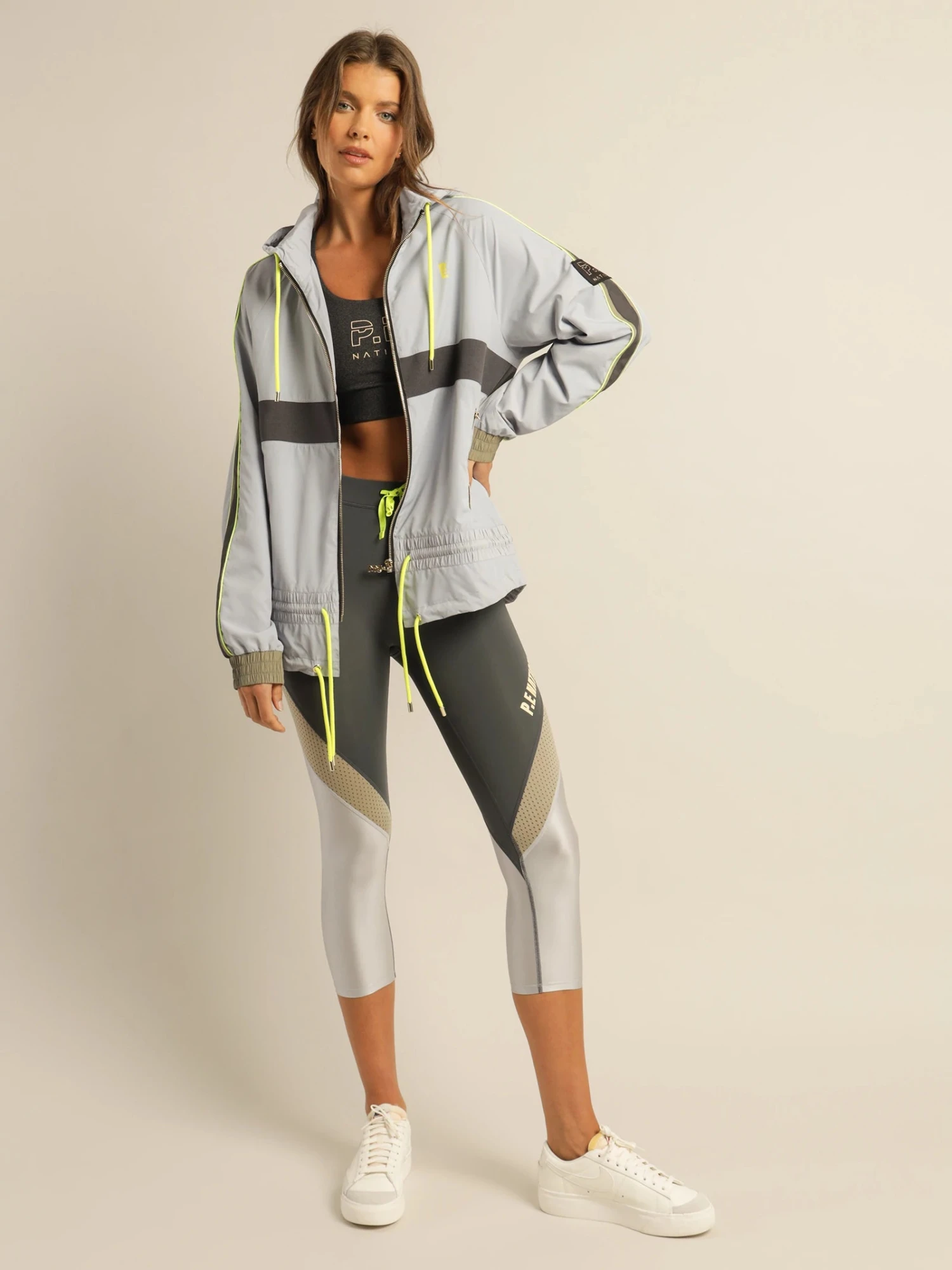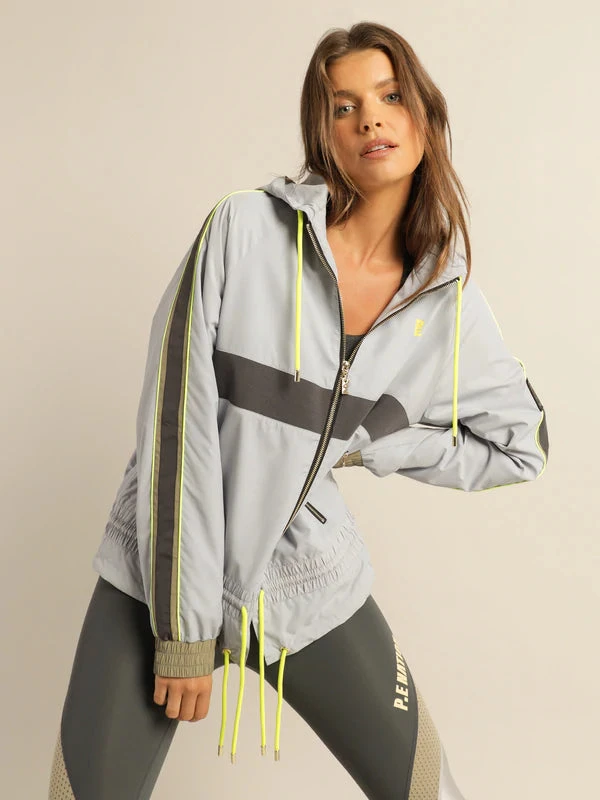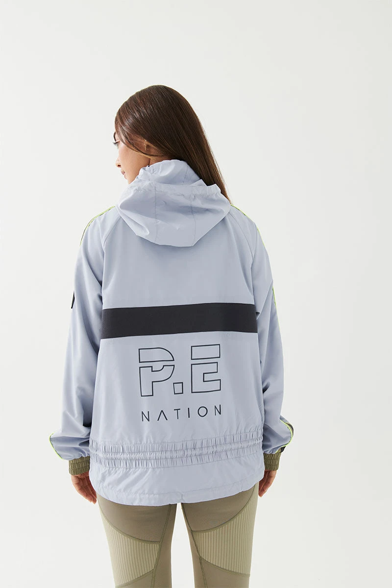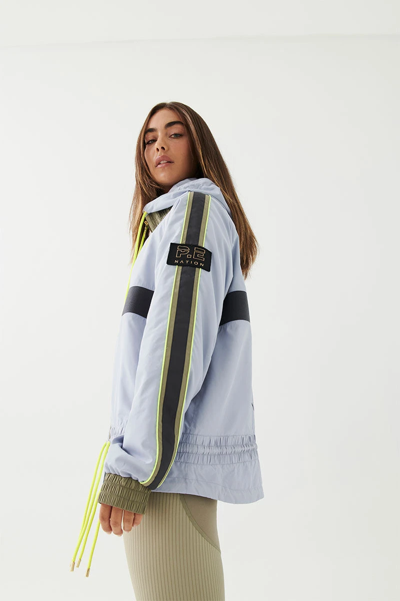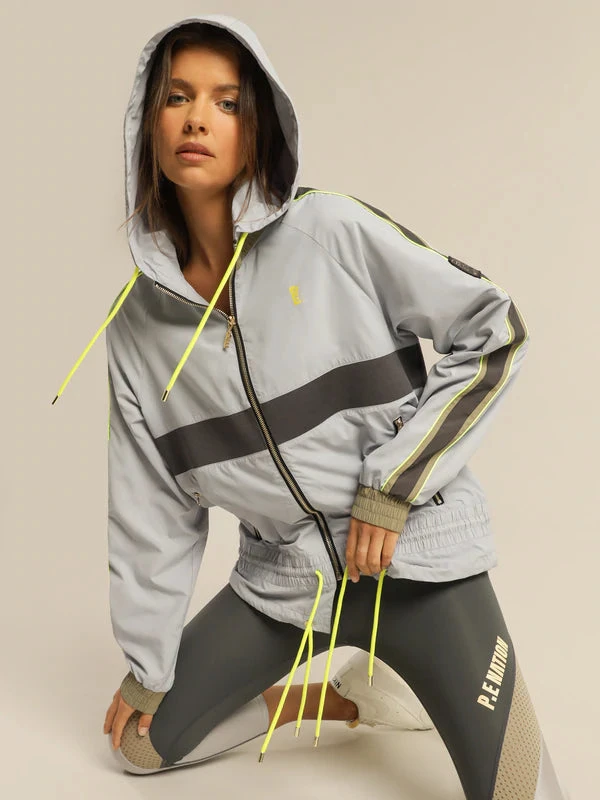 The Man Down Jacket in Grey Dawn is the ultimate lightweight water-resistant layer for trans-seasonal wear. The Man Down Jacket is a classic P.E Nation spray style. Featuring a generous hood, elasticated cuffs and functional drawcords at the hood and hem, with a gold-plated centre-front zipper to style your way and stay protected from the elements.