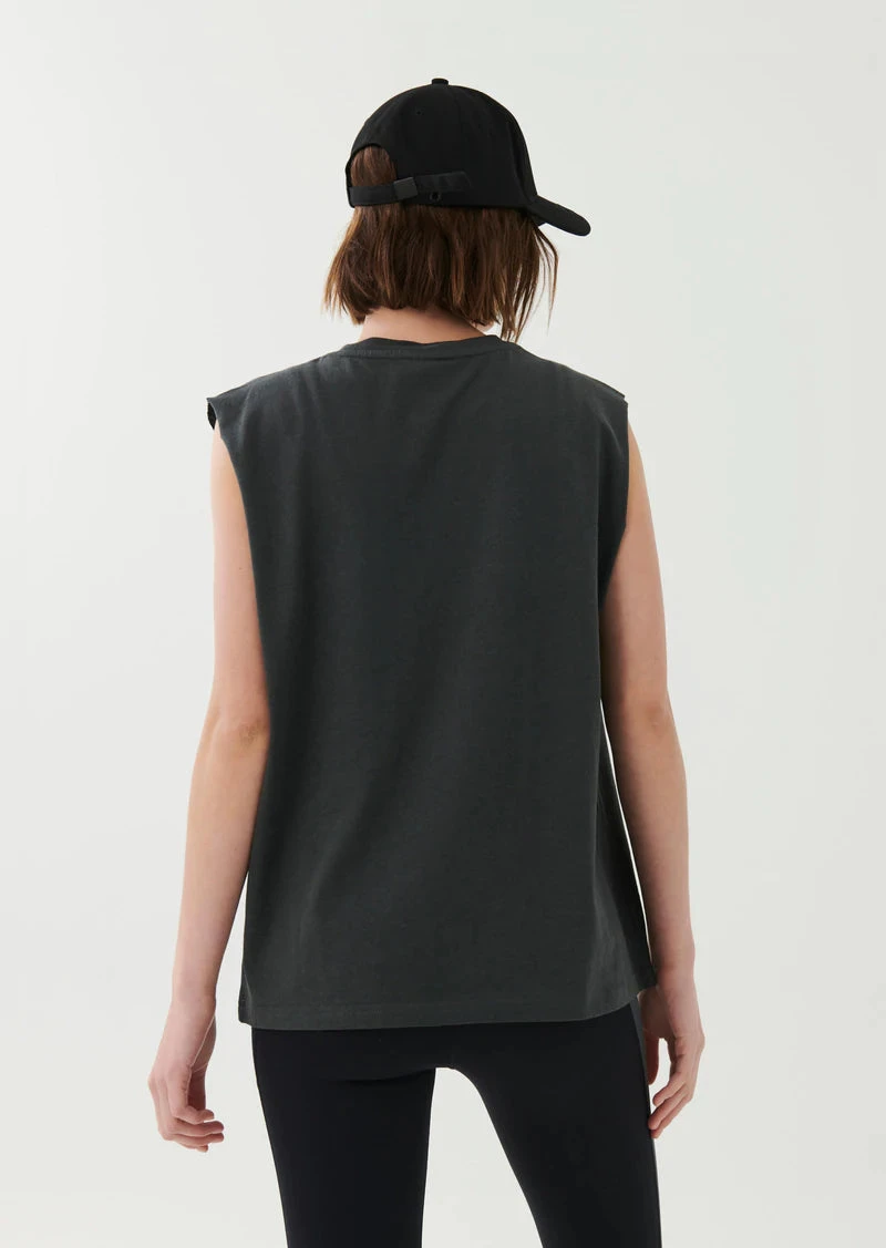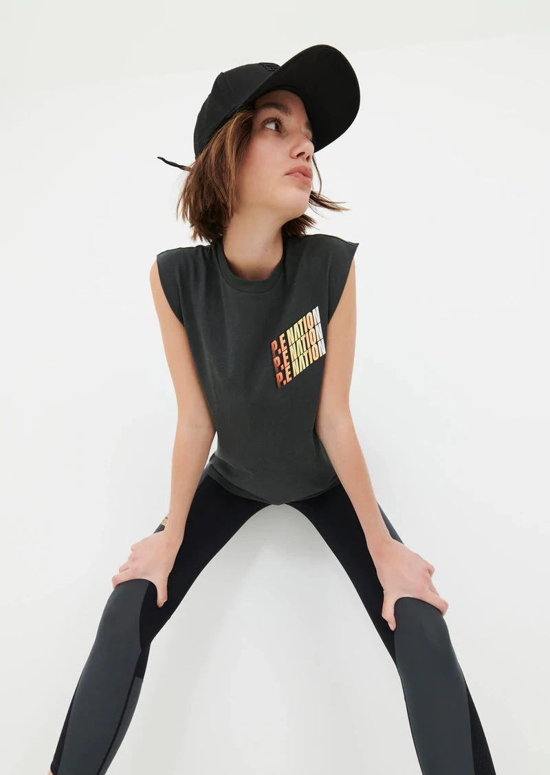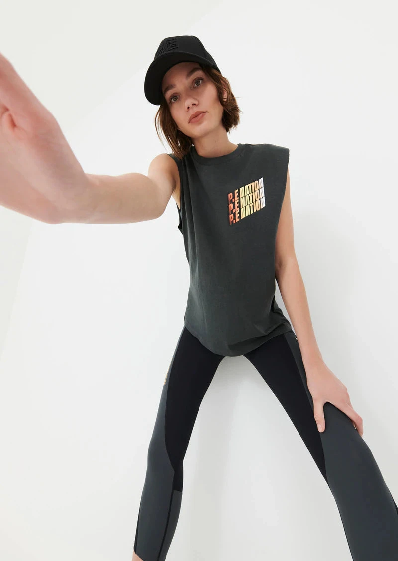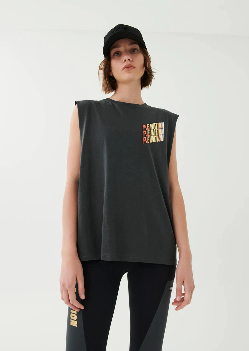 The Overtake Tank in Dark Grey comes as part of our Adventure Is An Attitude Collection. A relaxed fit tank with soft fine rib crew neck and raw cut armholes, the Overtake is an easy over-studio set layer for transitions between workouts and all through the day. Cut from an organic cotton and hemp blend fabrication, the Overtake Tank has a vintage tee vibe and texture that develops further over time with wear and care. A statement P.E Nation triple logo in gradient detailing completes the tank. Team it with the Half Volley Legging, Blast Legging, Ascend Short or Tiebreak Short.