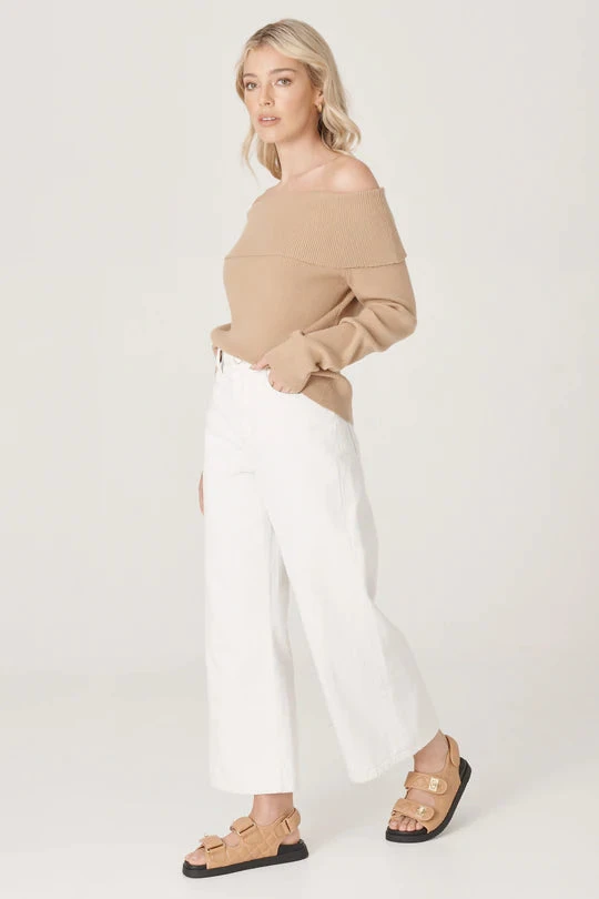The Dunes Knit is a beautiful ribbed knit with long arm length and slim shape through the body. Featuring an off the shoulder neckline, able to be worn as shown or bunched around the mid-arm.