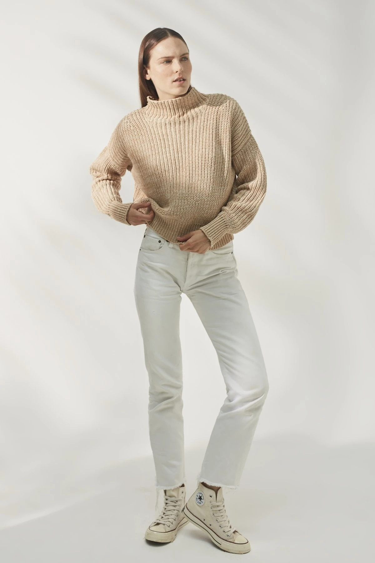 Featuring a raised wide fit neckline, dropped shoulders, and slight balloon style sleeves, with a modest crop finish, the Novah knit is a must have.