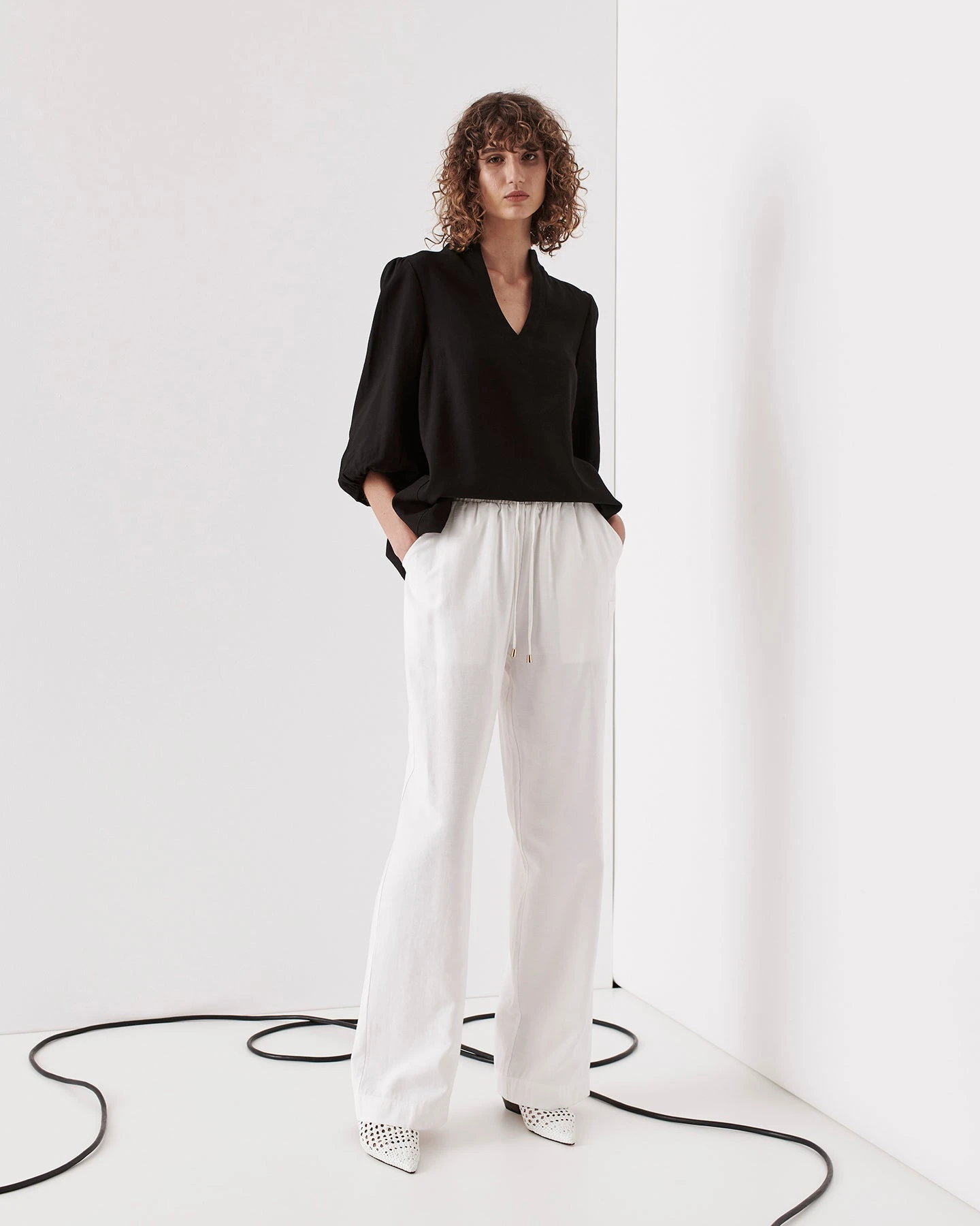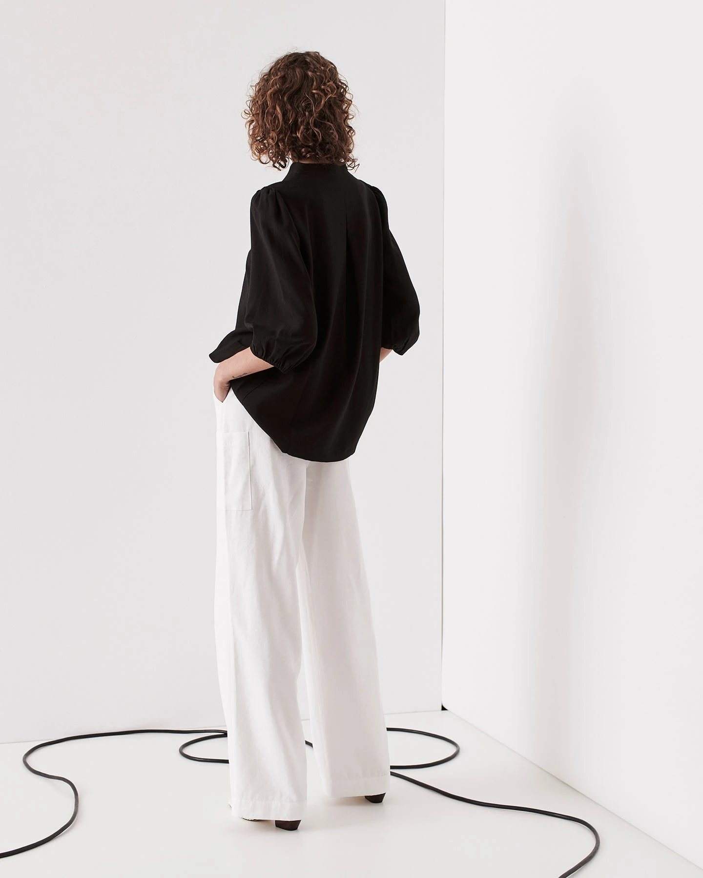 This loose fit shirt is the perfect addition to your summer wardrobe. Featuring a blouson elasticated sleeve, grown on collar and V neck. Available in both black and white.
