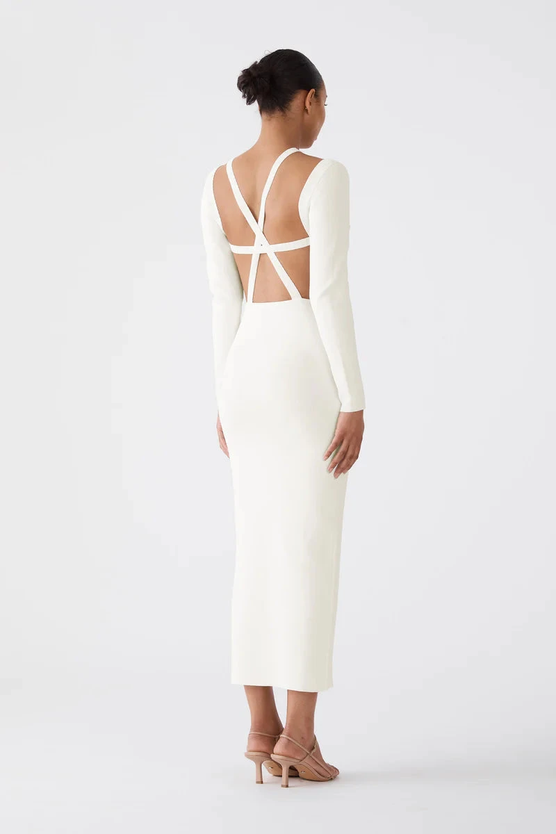 The Amalia Dress in Ivory by San Sloane is a classic silhouette with a modern twist, that is bound to turn heads. Crafted from a fine milano knit, the Amalia Dress features cross back detail with front thigh split. This is the ultimate cocktail dress.