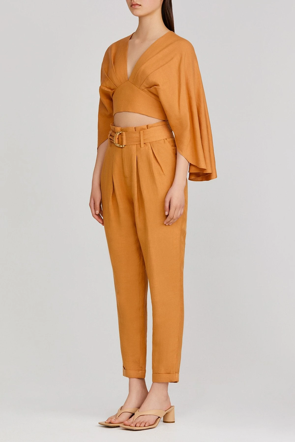 Designed to be fitted at the waist, the Cecile Pant in caramel is a wardrobe staple. Classic pleating and tapering, with cuffed hems and detailed waistband featuring gold hardware. Pair back with nude heels or slides. Also available in ivory and black.