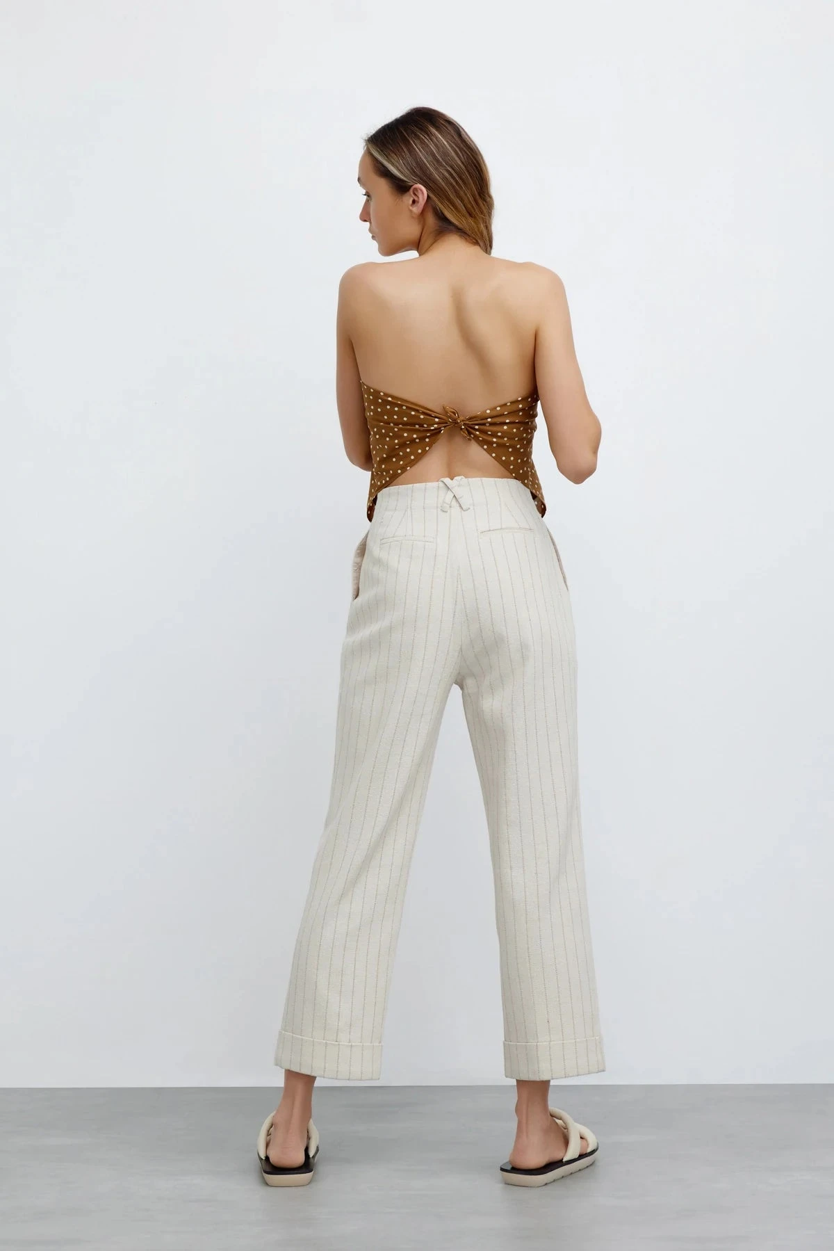 The perfect addition to your capsule wardrobe ~ the Emery Pant in Natural Stripe is crafted from a mid-weight cotton blend fabrication. High waist fit, functional inseam pockets with a front fly closure. Pair with slides for an every day look.