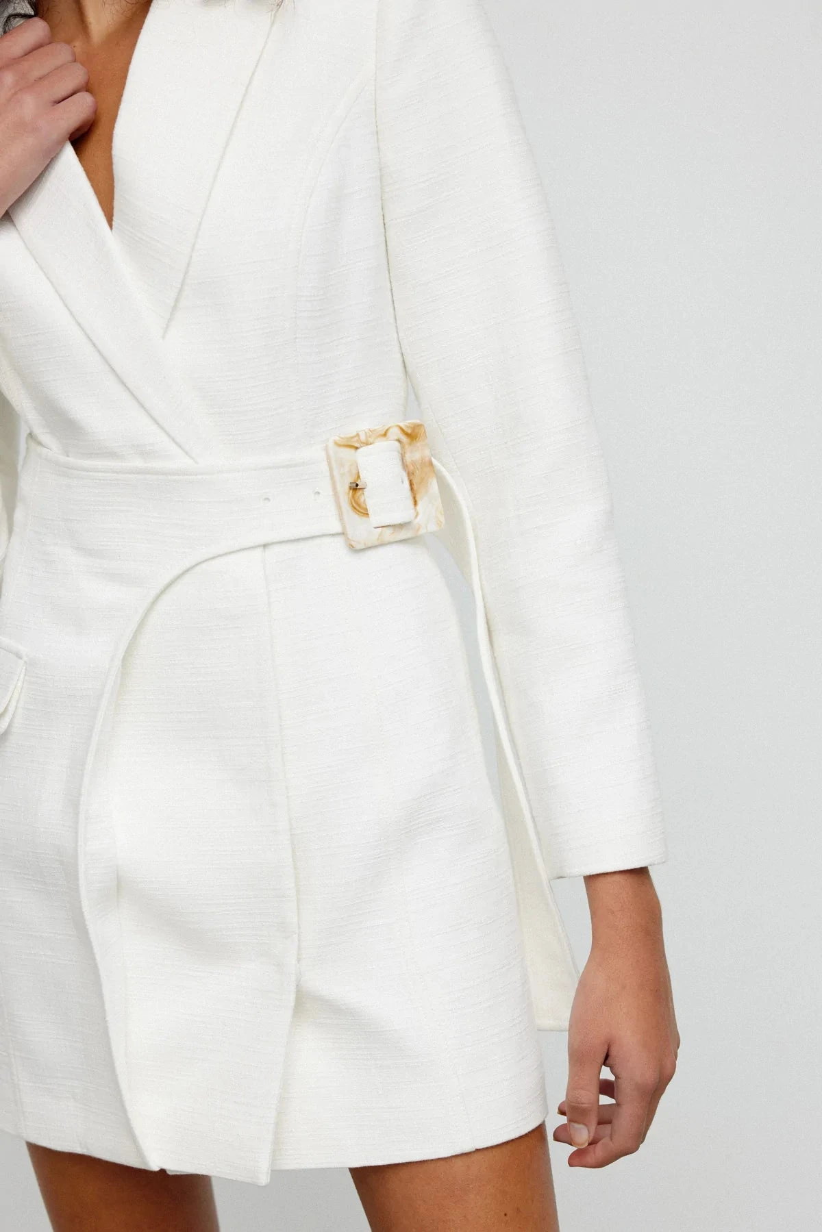 Crafted with the SO girl in mind, the Frankie Mini Dress in Cream is an elevated suiting style. Full length tailored sleeves, front button closure, wide lapels, adjustable waist belt and mock front pockets. Pair with a simple heel for an elevated finish.