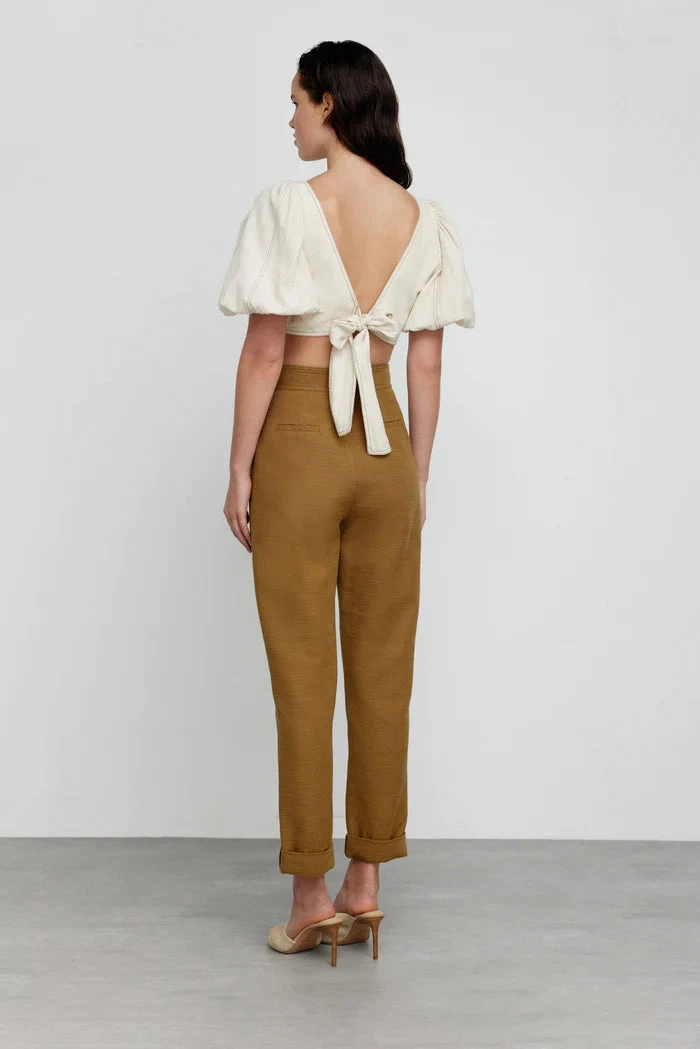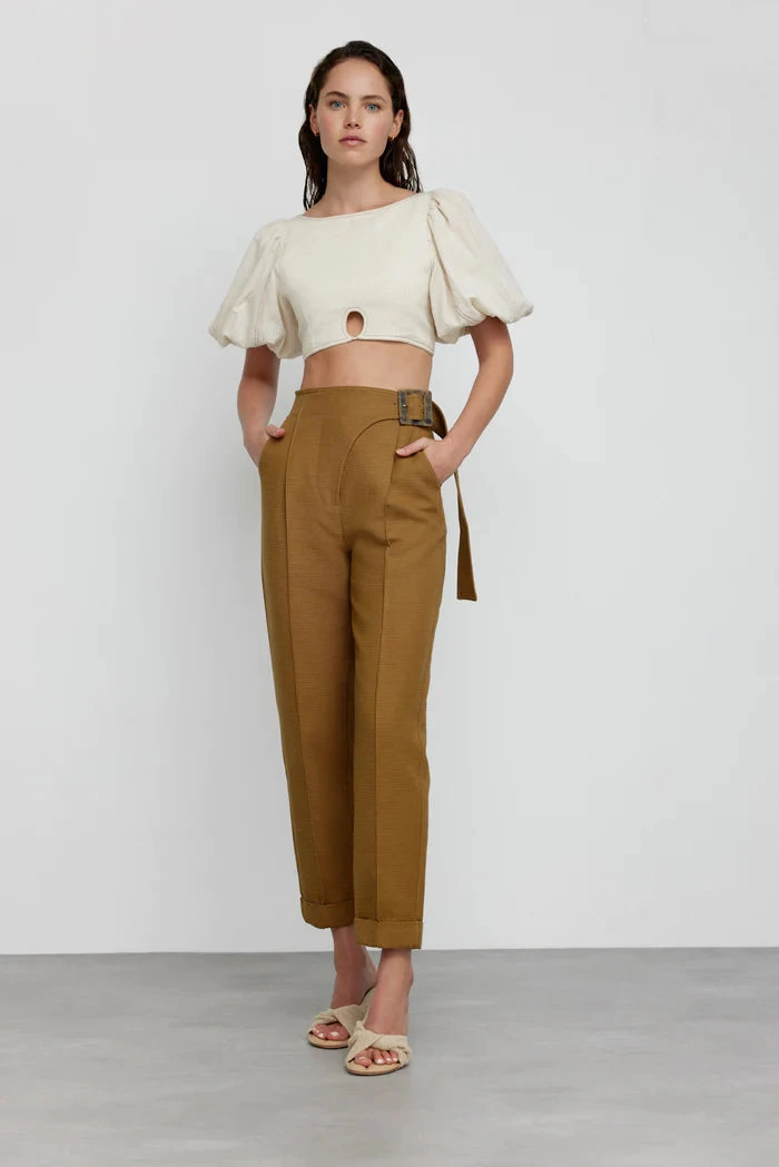 An abstract take on the classic Significant Other suiting silhouette ~ the Frankie Pant in Olive are designed to be fitted at the waist and relaxed toward the hem. Curved edges highlight an adjustable waist belt, pleats toward the hem and a custom designed resin buckle.