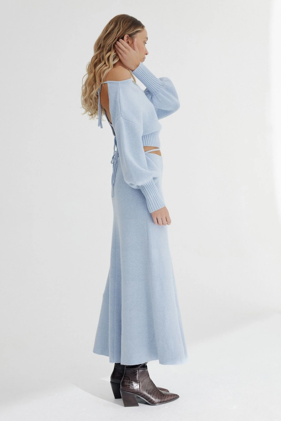 The Lia Knit Top in Blue Marle was designed with the SO girl in mind. A beautiful knit fabrication that offers warmth and versatility to your wardrobe. Full length sleeves, off shoulder design, open back feature with adjustable ties and ribbed waistline. Pair with the Lia Skirt for a complete look.