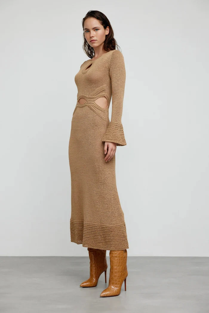 A stand out piece from the collection, the Saoirse Maxi Dress in Biscuit is an elevated silhouette. Crafted from a luxurious crotchet fabrication, featuring cut out detail at the waist, open crotchet panel at the hem and centre front keyhole design.