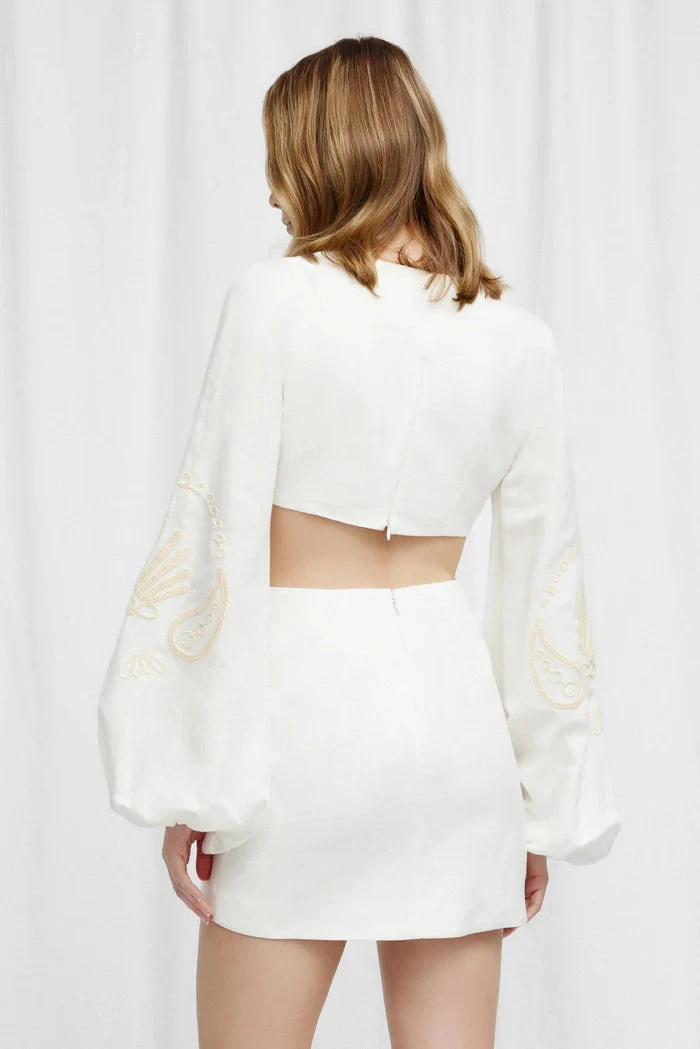 The Seren Mini Dress in Ivory is a playful addition to the collection. Crafted from a structured linen blend fabrication, this piece features an intricate embroidered design, crafted by our in house graphic designer. Full length sleeves, V-neckline and open back detail. Pair with a simple heel for a complete look.