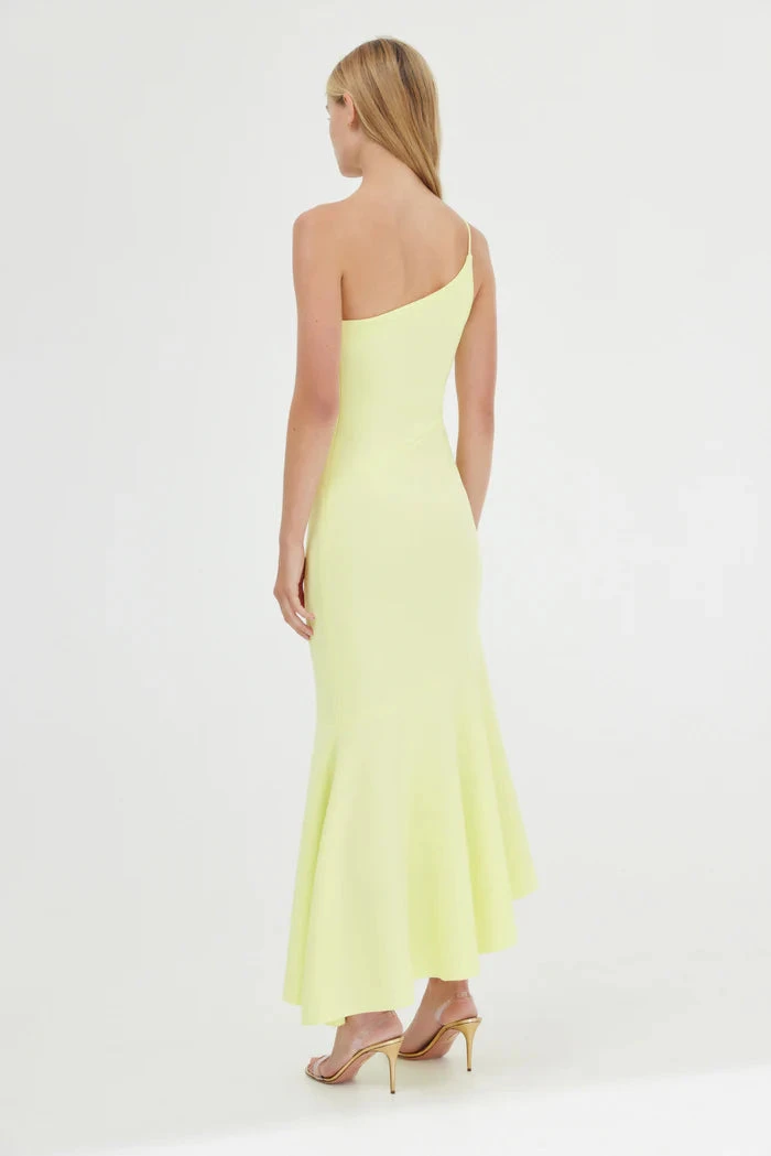 An elegant addition to the collection, the Tori Dress in Citron is designed to be fitted at the bodice and drape toward the hem. Crafted from our best selling crepe fabrication, this style features a one shoulder design, asymmetrical hemline and gathered fabrication creating soft ruffles toward the hem.