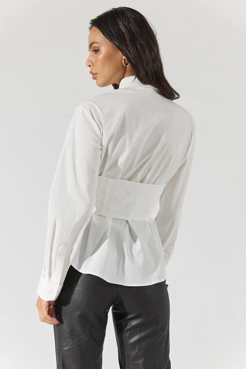 The Capture Corset Shirt in Milk from Sovere Studio is the basic white button down shirt that is anything but basic. Featuring an inbuilt corset detail to accentuate the feminine form, the Capture Corset Shirt is ideal for work or play.