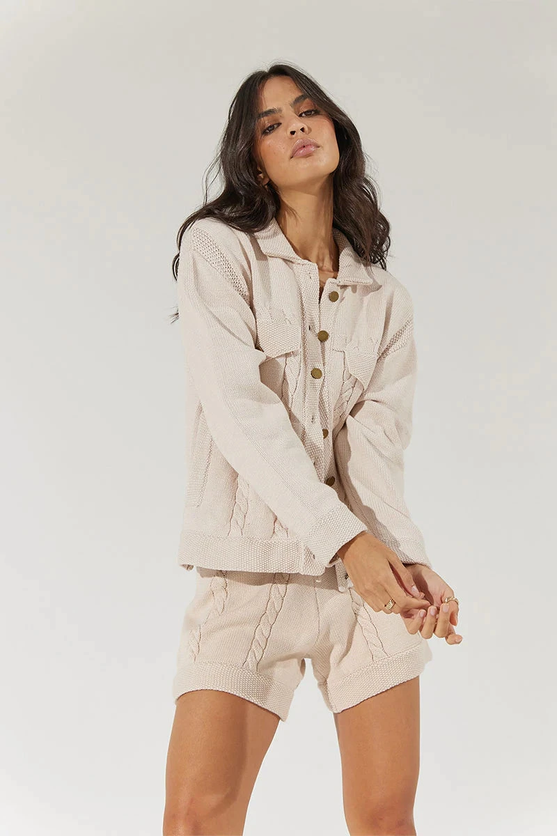 The Escape Knit Trucker from Sovere Studio is a cotton blend cable knit referencing the silhouette of your favourite denim jacket. A modern take on knitwear that is certain to be a favourite this winter.