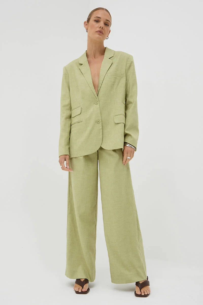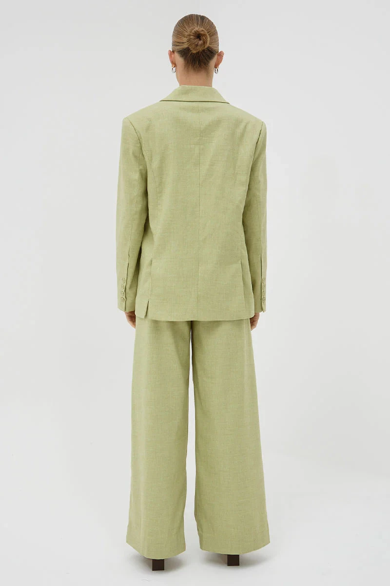 The Origin Pants in Matcha from Sovere Studio are a mid-weight, blend suiting pants featuring a tailored fly opening, pleats, waistband, and functional pockets. The stretchable fabric is designed to provide a perfect fit, while the lined construction ensures comfort and style.