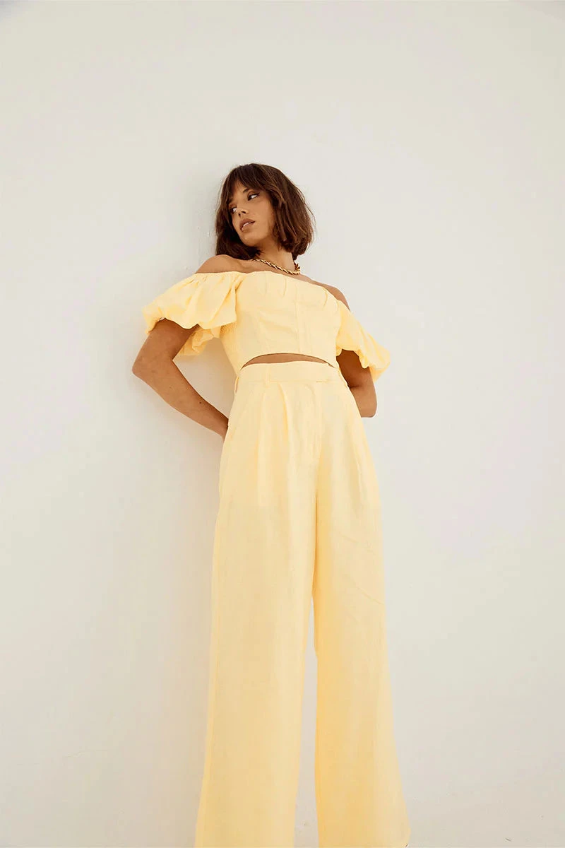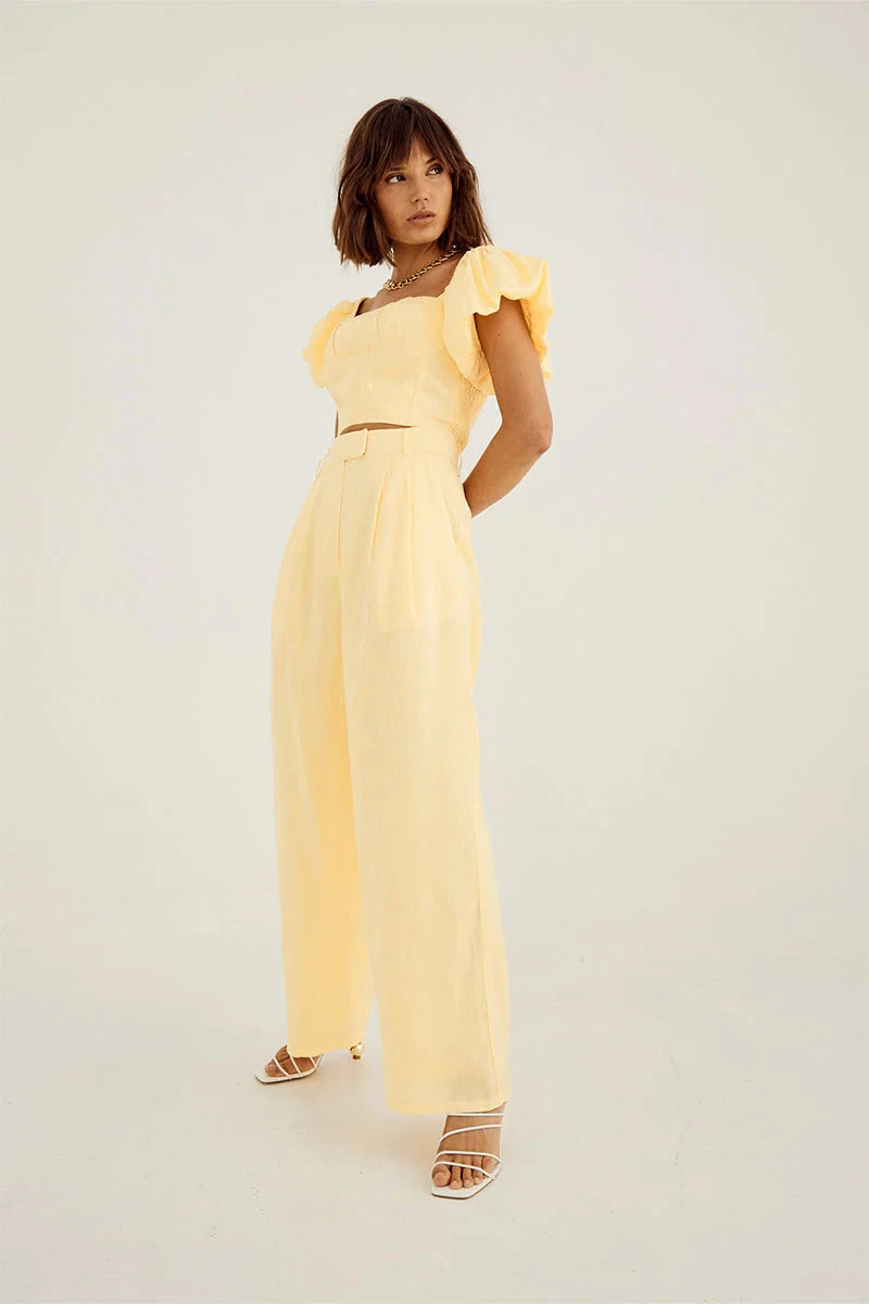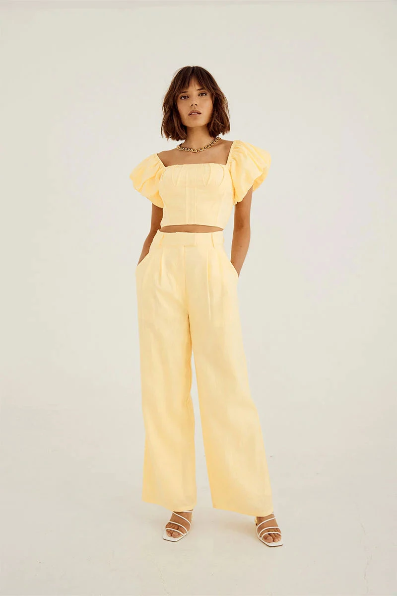 The Relish Pant in Lemon Butter from Sovere Studio Is the perfect easy breezy summer pant. Featuring a flattering high waist and a washed linen fabrication that makes for the perfect fit. Pair with the Relish bodice for the perfect ensemble.